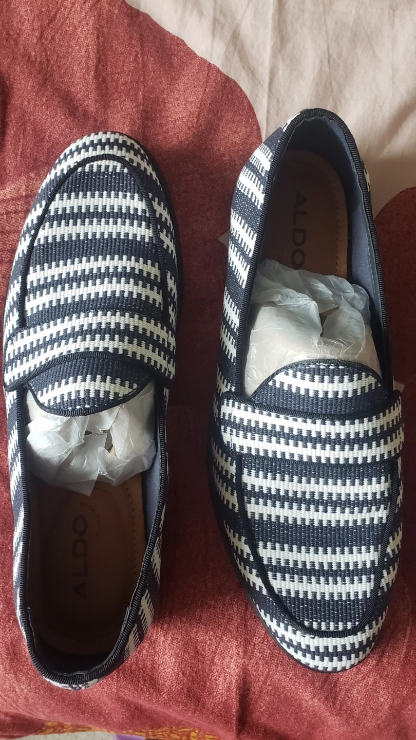 These unisex ALDO loafers feature a stylish navy and white woven pattern. The insole is made of genuine leather for comfort. Made in China.