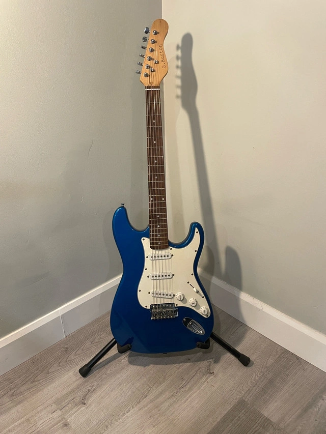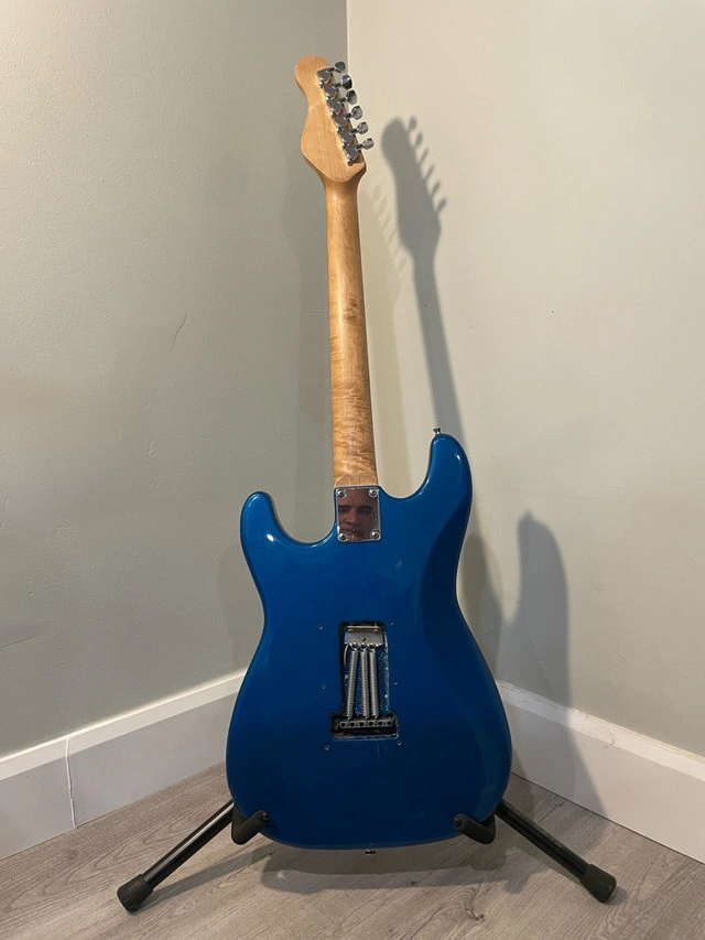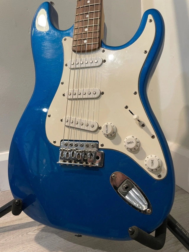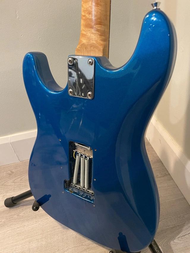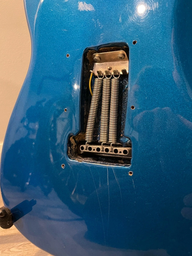 15Good shape. Comes newly stringed with D’Addario XL strings. Just missing the back cover to access the strings and springs for the wammy bar.
