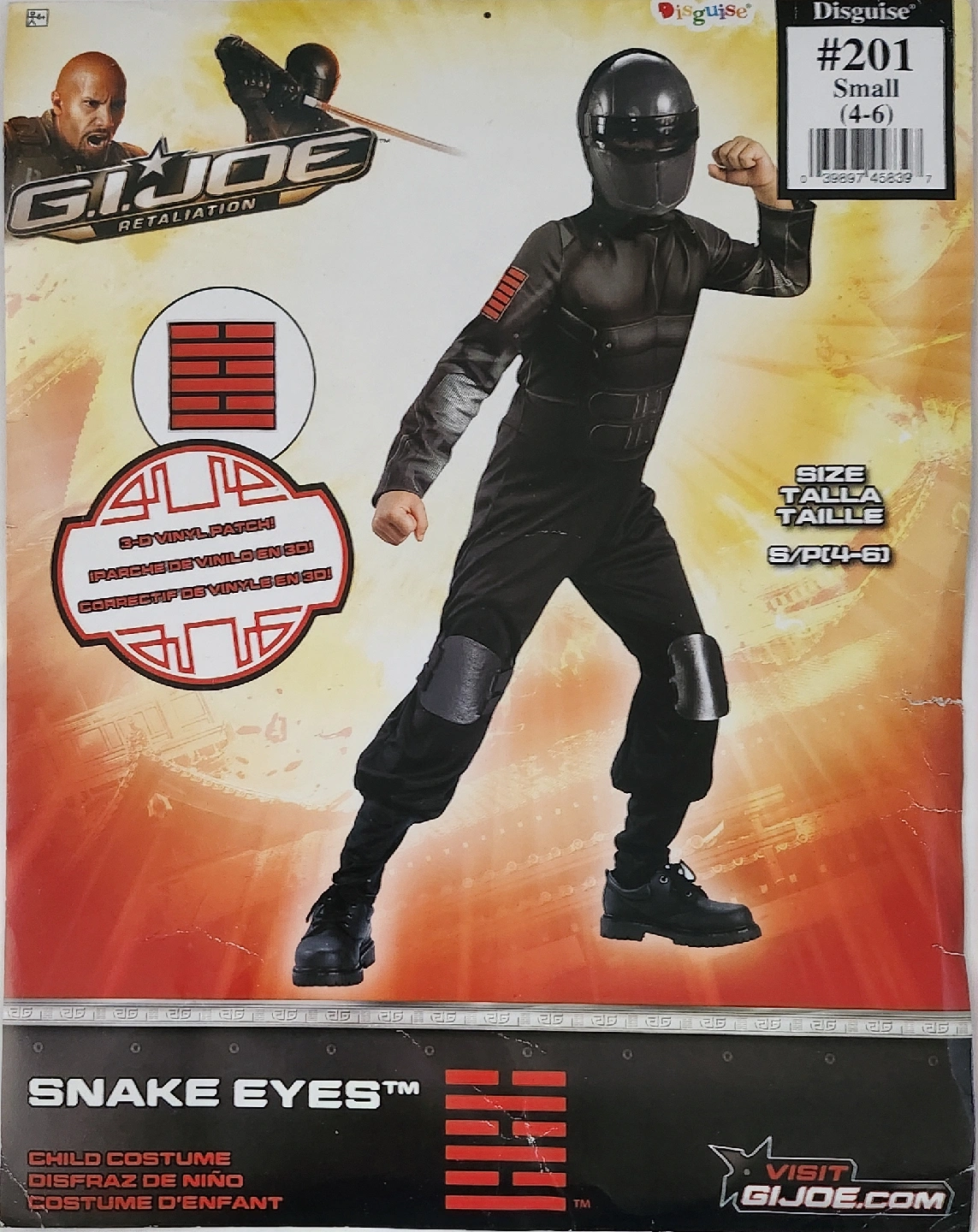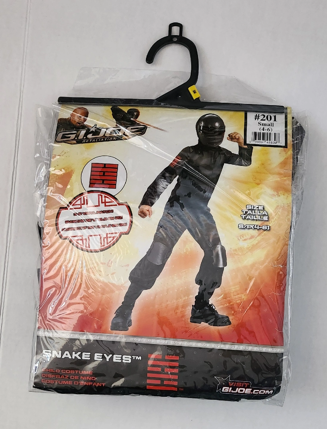 G.I. Joe Snake Eyes costume sizes 4 to 6 years old, SMALL 3 piece costume: - Jumpsuit - Mask - 3D Mask (Boots not included)
