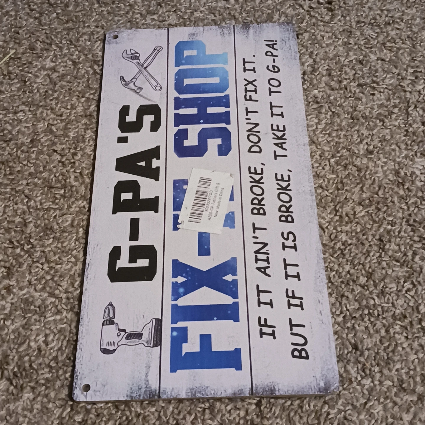 26Looking to add a touch of humour to your space? This G-Pa's Fix-Shop wooden sign is perfect! It features a witty saying: "If it ain't broke, don't fix it. But if it is broke, take it to G-Pa!"
