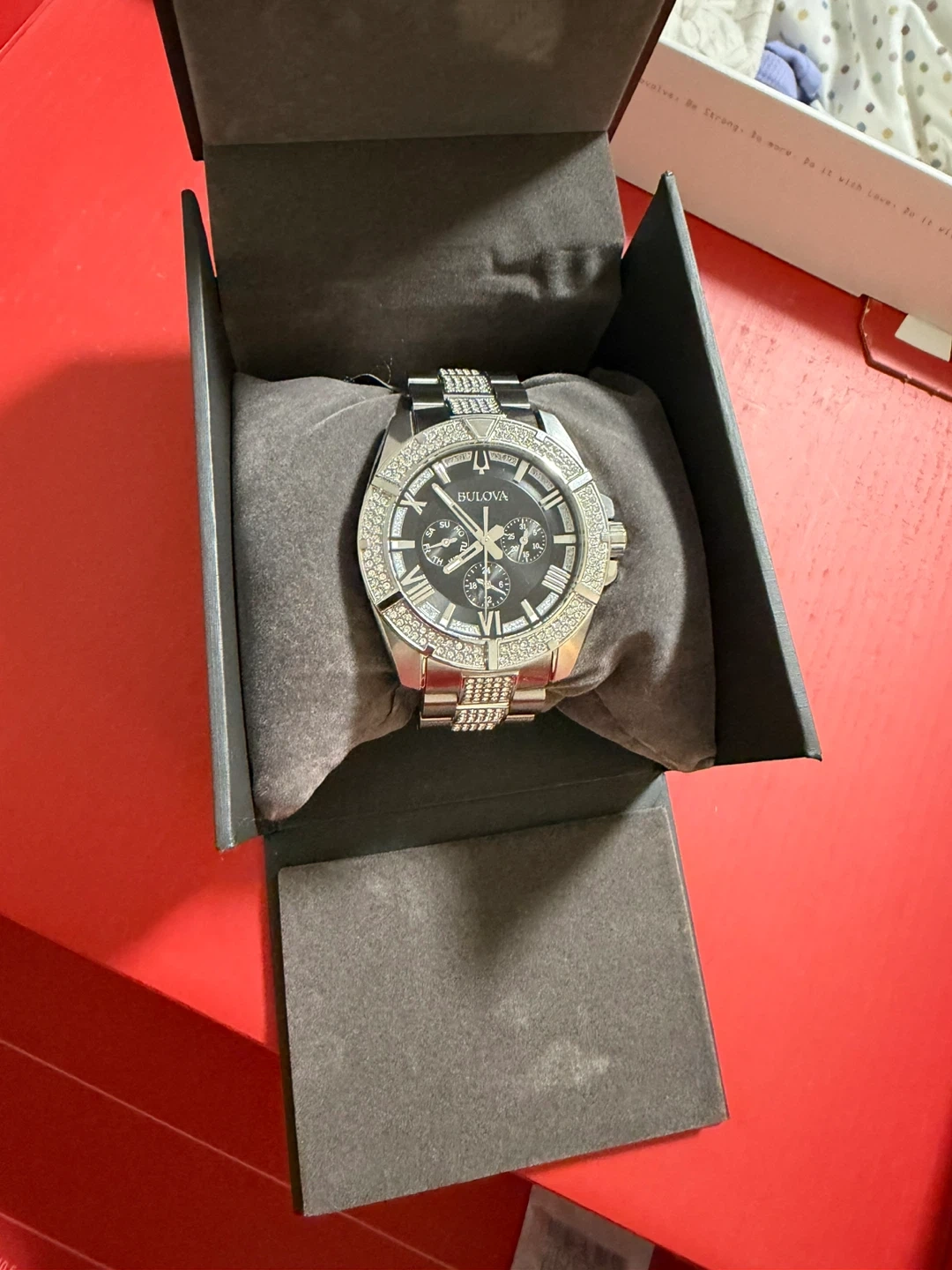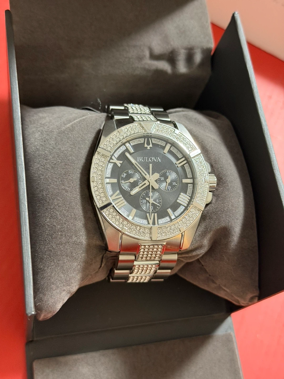 Selling a beautiful Bulova men’s chronograph watch in excellent condition. This watch features a black dial with Roman numerals, diamond-accented bezel, and stainless steel bracelet, giving it a bold luxury look.