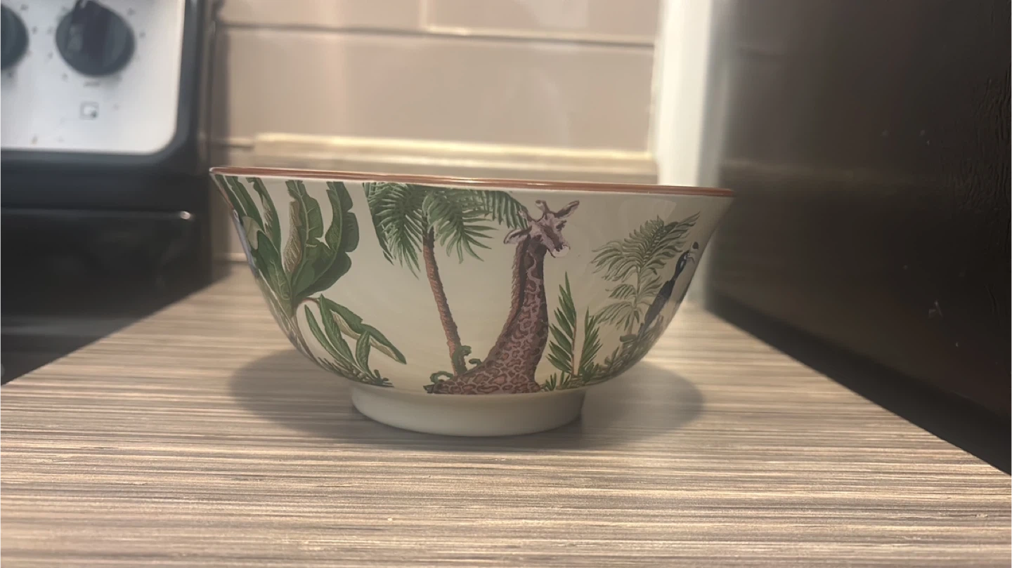 Set x 4 . This ceramic bowl features a vibrant tropical scene with a giraffe and lush foliage. It's perfect for serving snacks or as a decorative accent piece. Diameter measures approximately 8 inches.