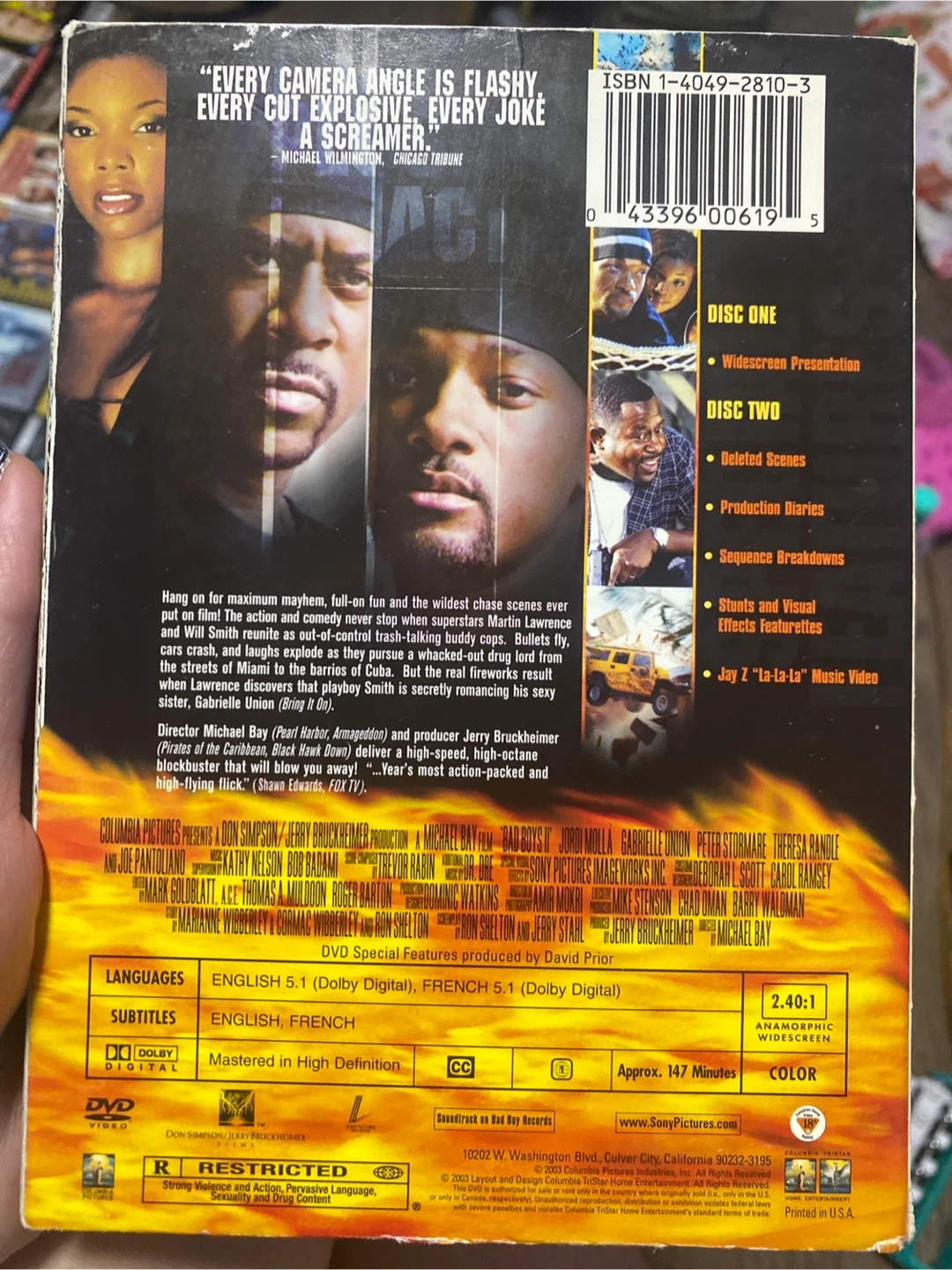 Selling a DVD copy of Bad Boys II starring Martin Lawrence and Will Smith! It's a widescreen presentation with deleted scenes, production diaries, and sequence breakdowns. It also features stunts and visual effects featurettes, and the Jay Z "La-La-La" Music Video. Languages include English and French with subtitles available