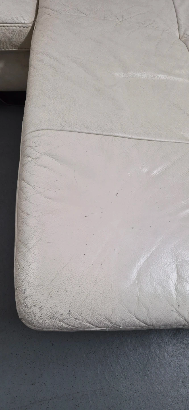 A white leather sectional sofa. The material is real leather purchased from Ashley Furniture for over$3,000. It has some scuffs and wear on the edges from our cat. Right facing sectional. This sofa would fit well in a living room or large den.
