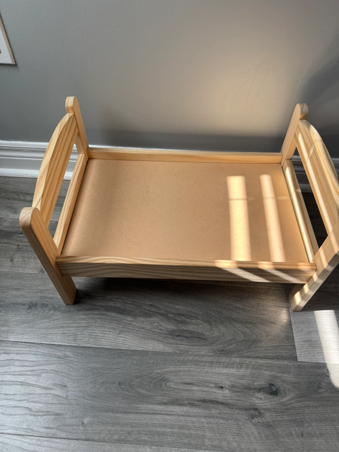 A charming wooden bed designed for dolls. It's made from natural wood and features a simple, sturdy construction. Perfect for a child's imaginative play!