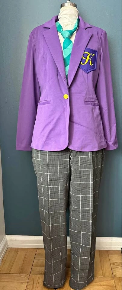 Teruki Hanazawa from Mob 100. Jacket women’s size 8 (custom sewn pocket hand painted K), pants women’s size 10 (hand painted plaid), hand painted tie.
