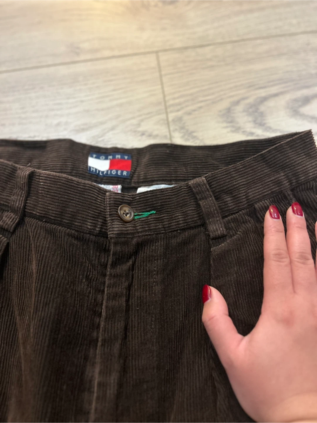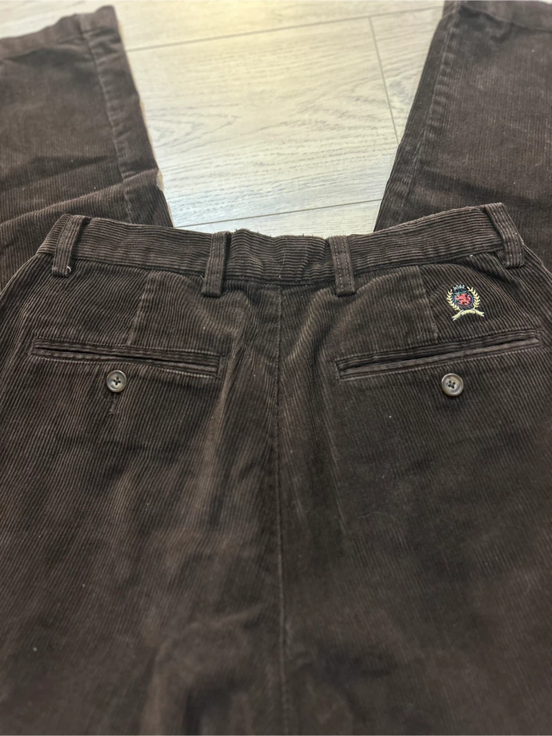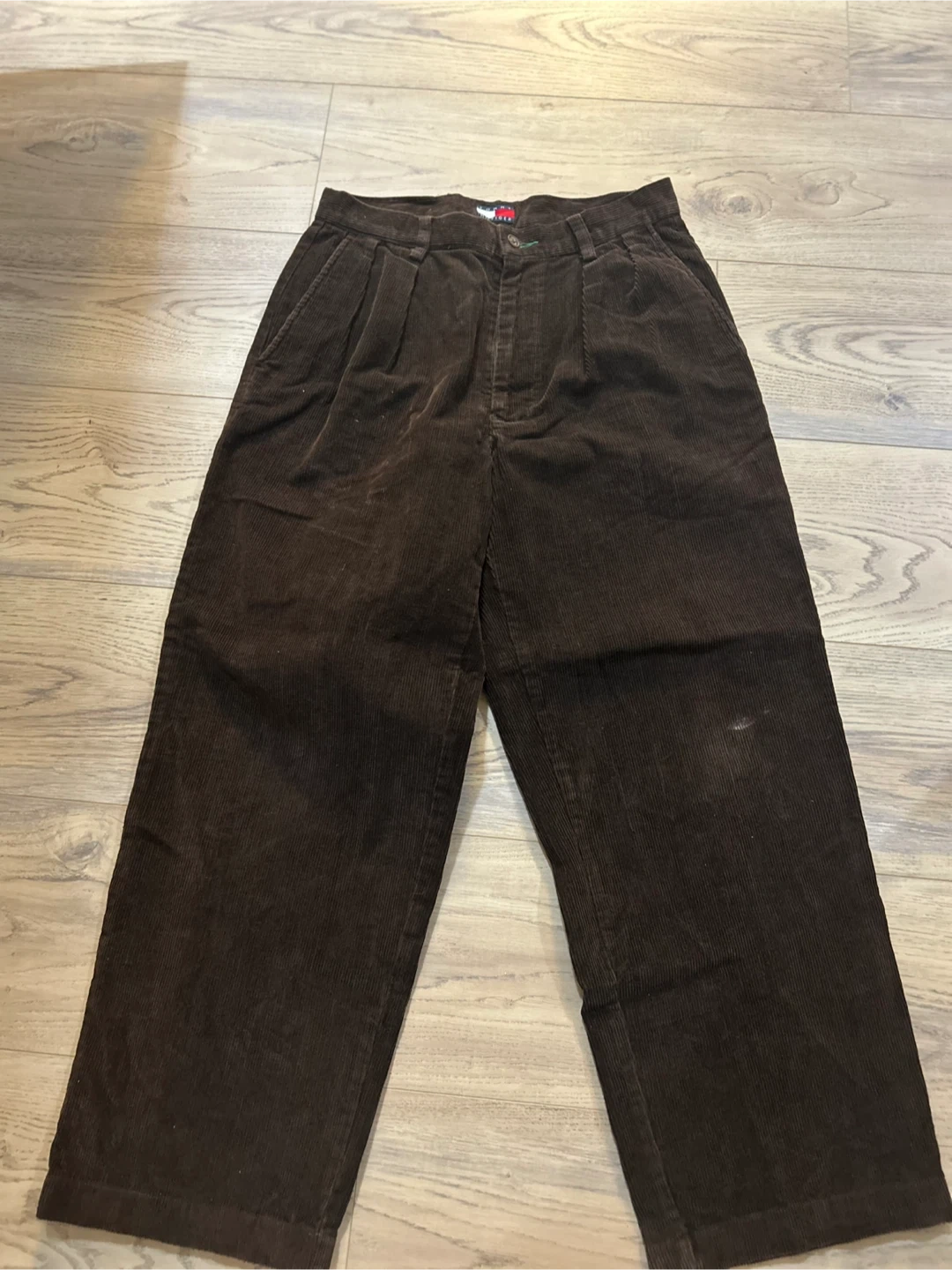 Classic brown corduroy pants from Tommy Hilfiger. These trousers are made with a comfortable corduroy material. Features a pleated front and two back pockets.30/32