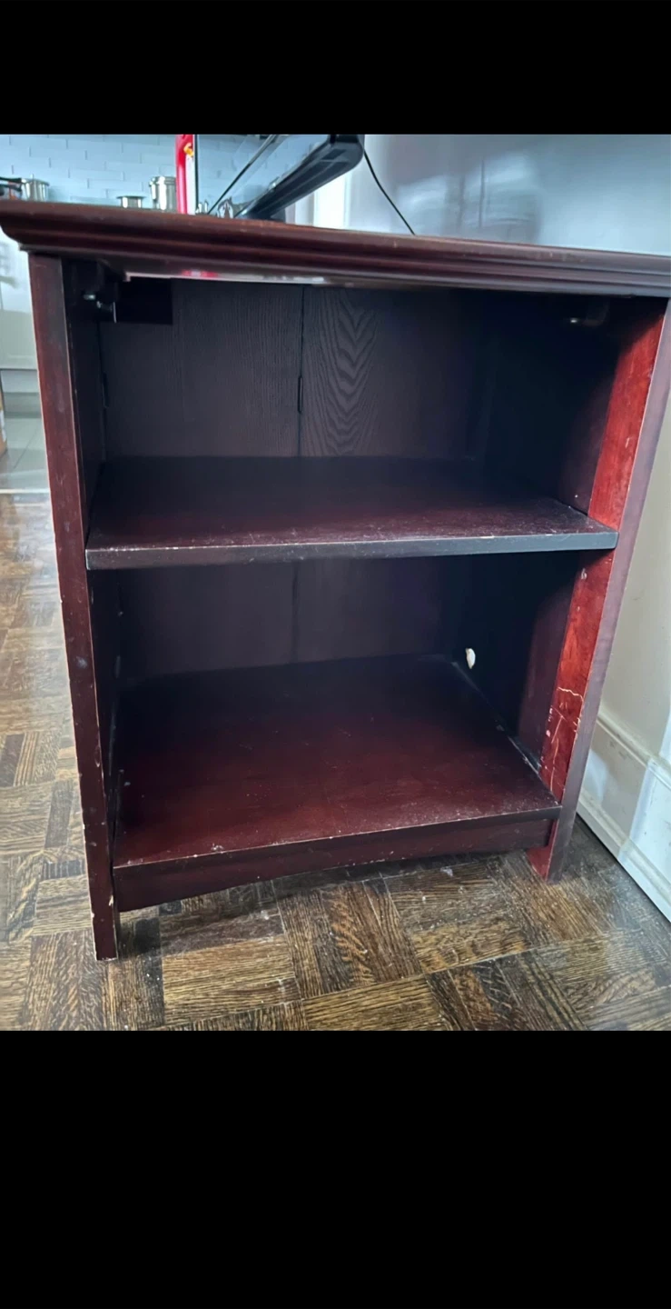 Selling a wooden TV stand. It has a glass door with stickers on it, and shelves for storage. It's a great piece for any living room.
