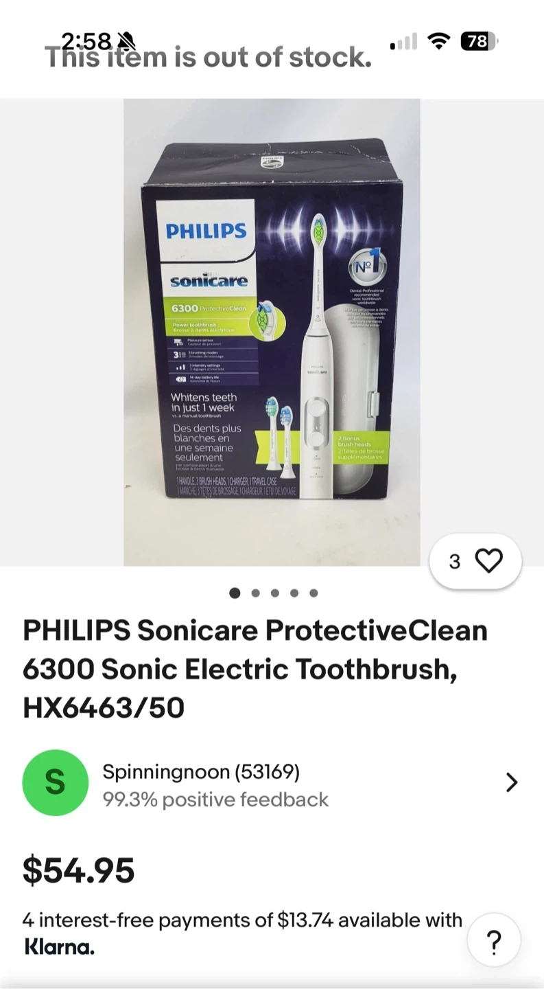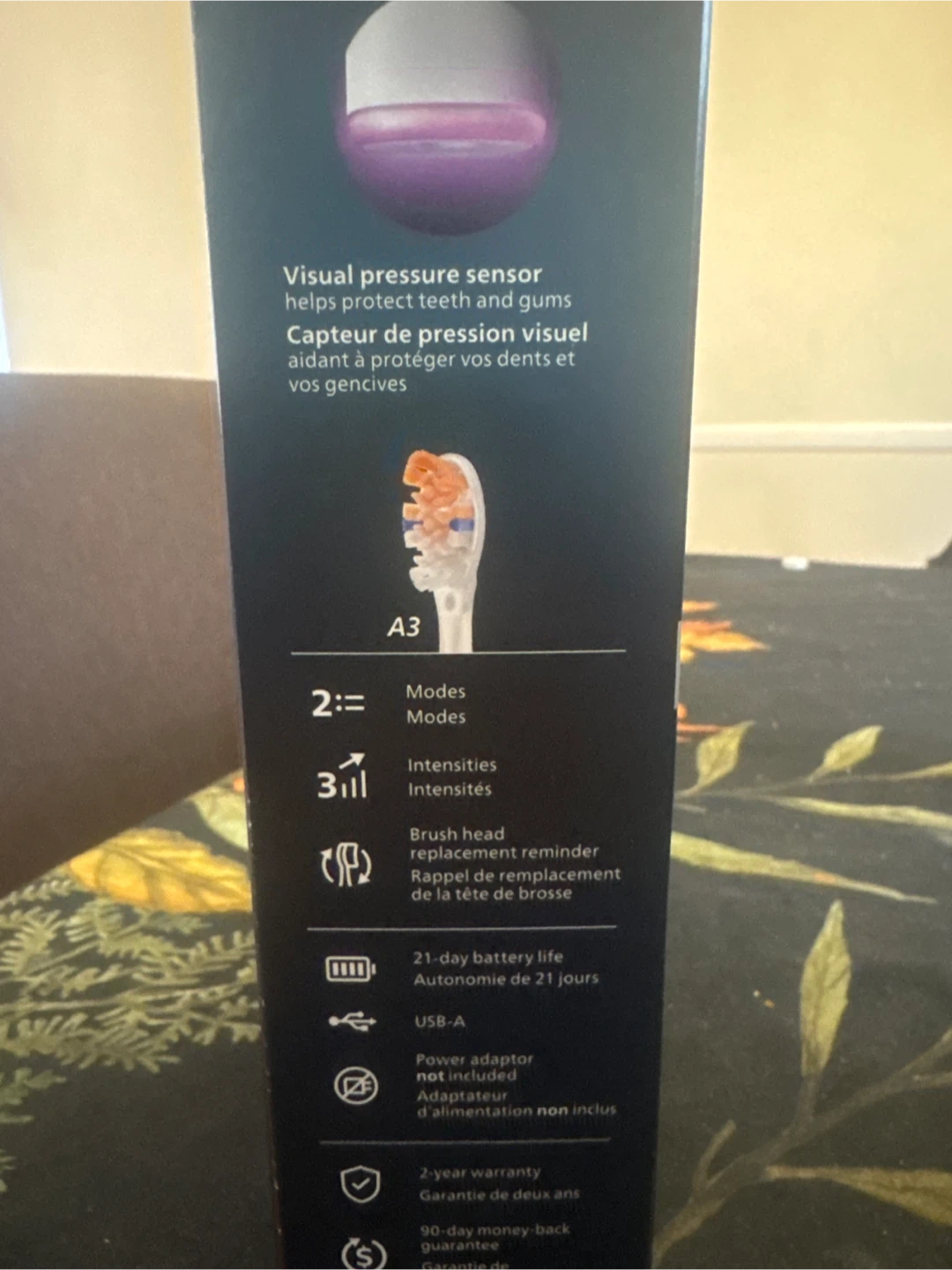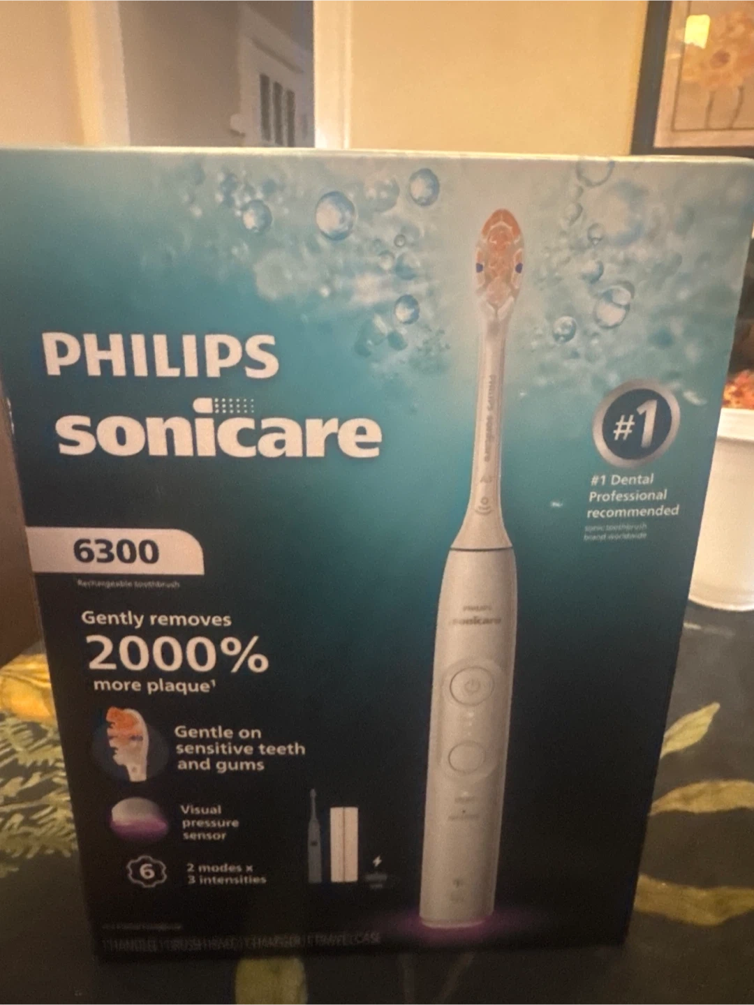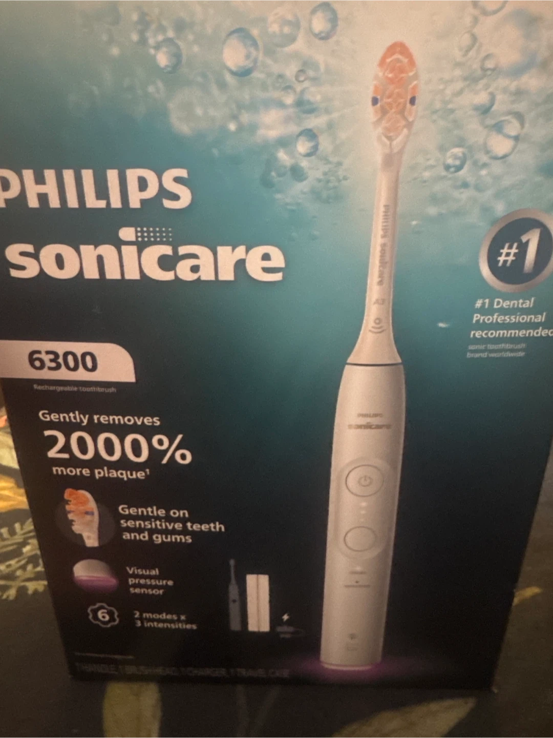 This Philips Sonicare ProtectiveClean 6300 electric toothbrush is designed to gently remove plaque and is recommended by dental professionals. It features 6 modes and 3 intensities, a visual pressure sensor, and a 21-day battery life. USB-A charging is supported. It includes the toothbrush handle, charger, and travel case.