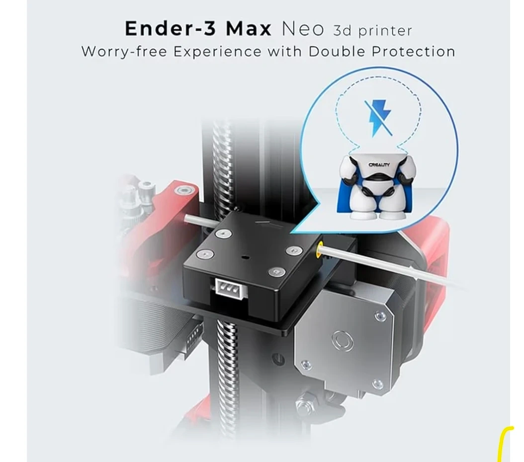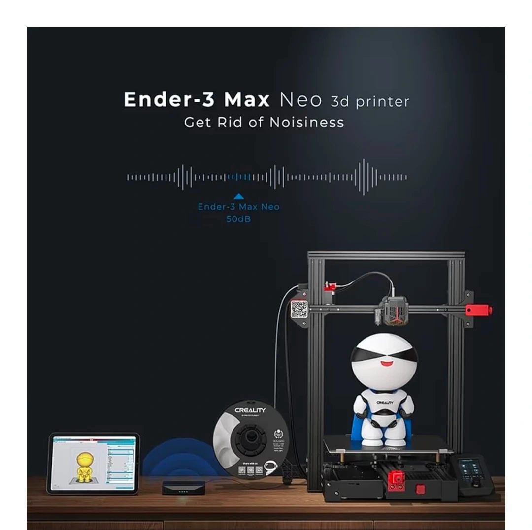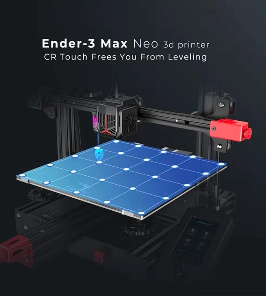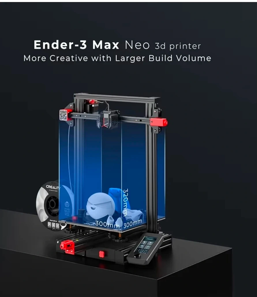 This is a Creality Ender 3 Max Neo 3D printer. It features CR Touch auto leveling and a dual Z-axis. The printer has a 4.3" color knob screen and a printing size of 300x300x320 mm. It's great for creating larger builds! Cover included.