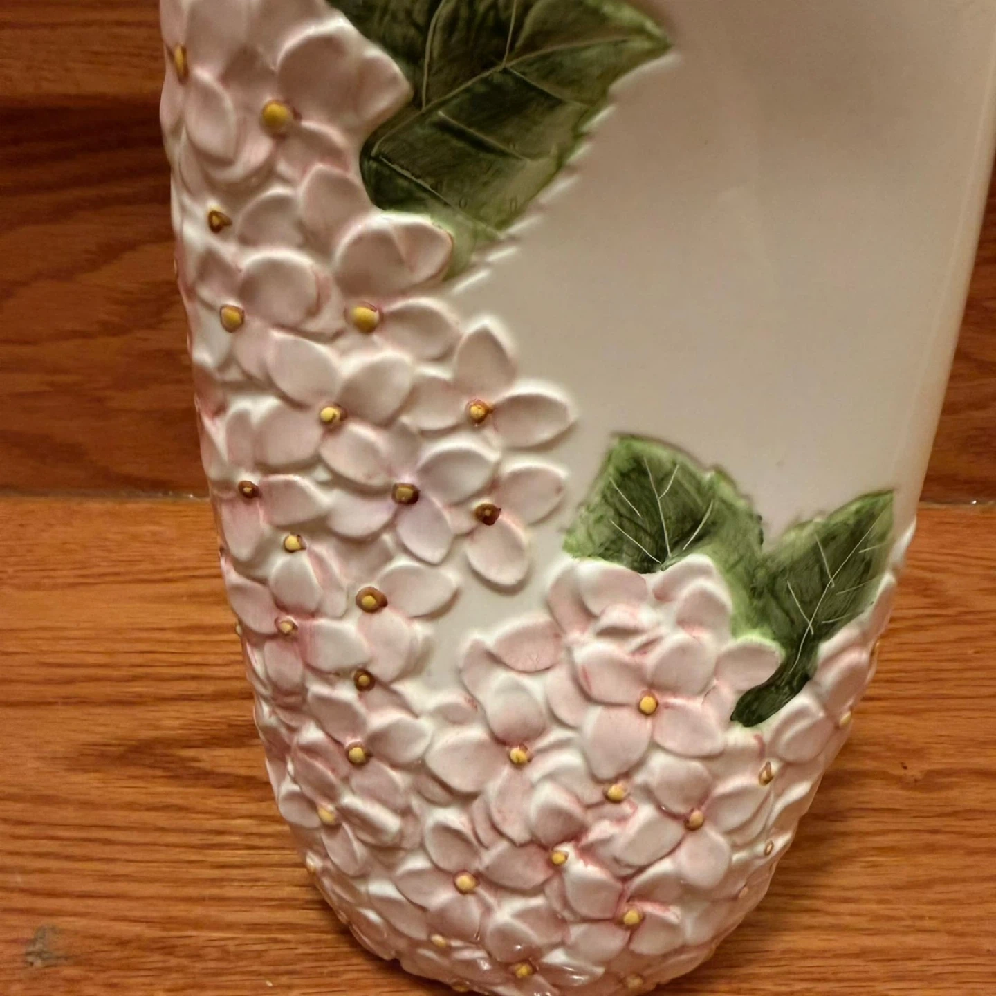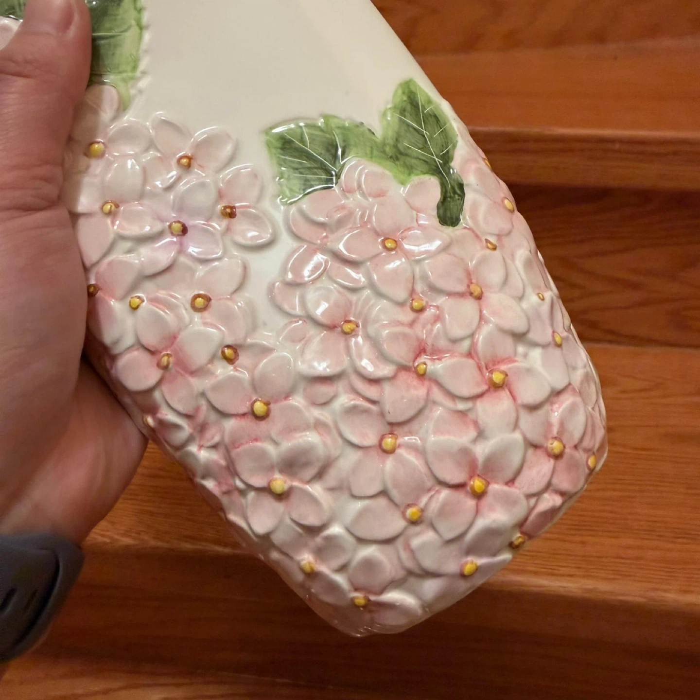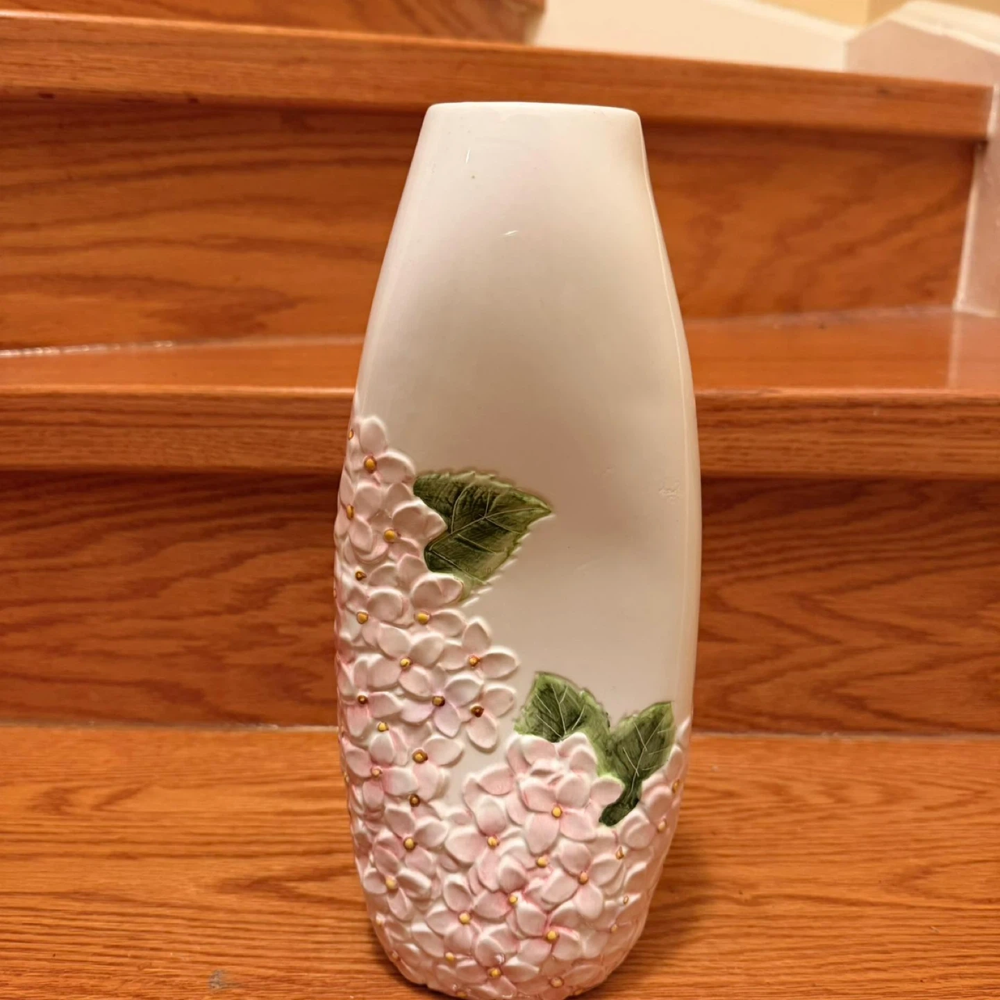 This is a lovely white ceramic vase featuring a detailed embossed design of pink hydrangeas and green leaves. It's perfect for displaying fresh or artificial flowers. The vase has a smooth finish and a substantial feel.