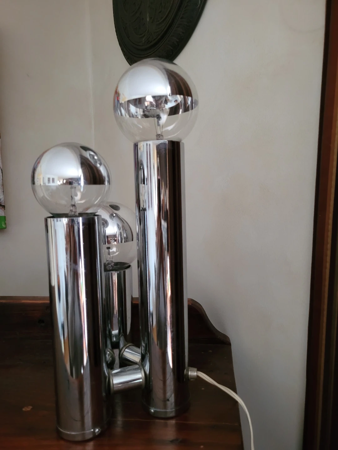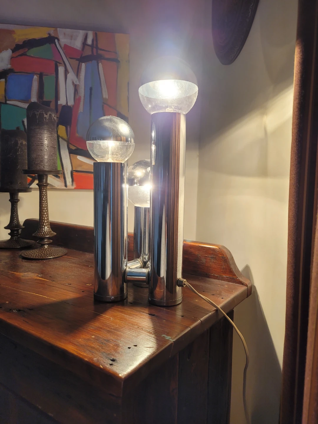 This striking 1960's chrome lamp features three spherical glass shades on cylindrical chrome bases. Bulbs are original. It has a dimmer switch for adjustable lighting. While it does work as seen in pictures, it might need rewired as it's old? It's currently in use...H:15"xW:6"