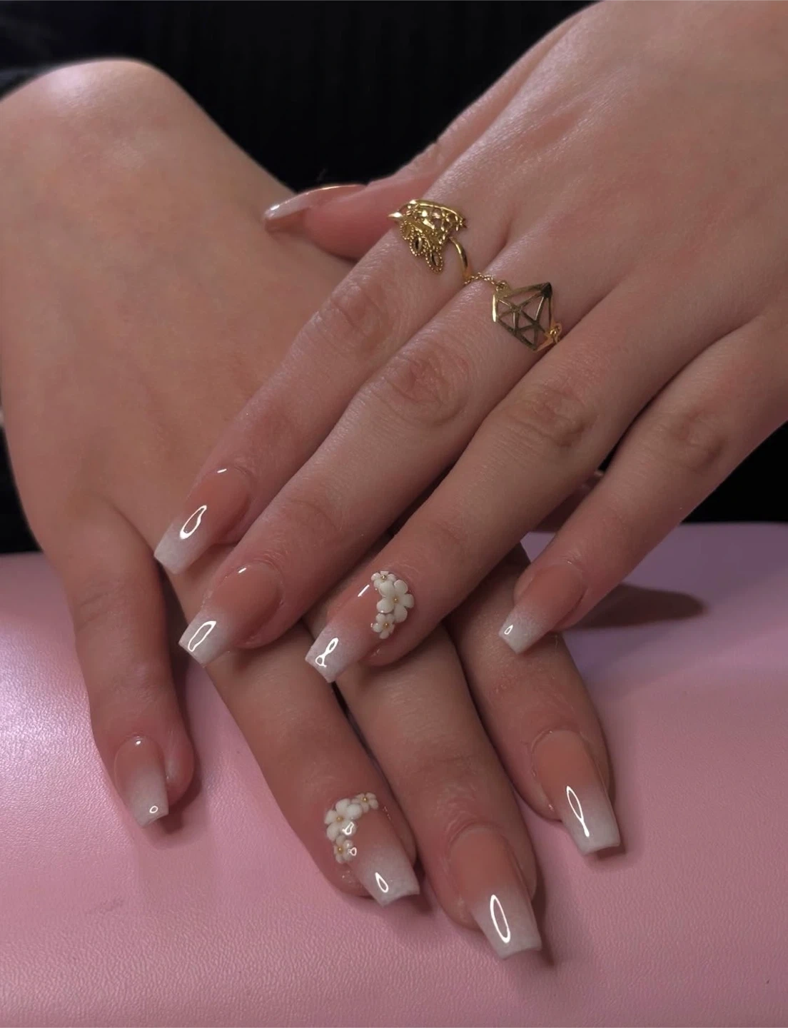Beautifully crafted custom nail art featuring various designs. Choose from elegant floral accents, chic French ombre, or striking green and gold patterns. Perfect for adding a touch of flair to any occasion!