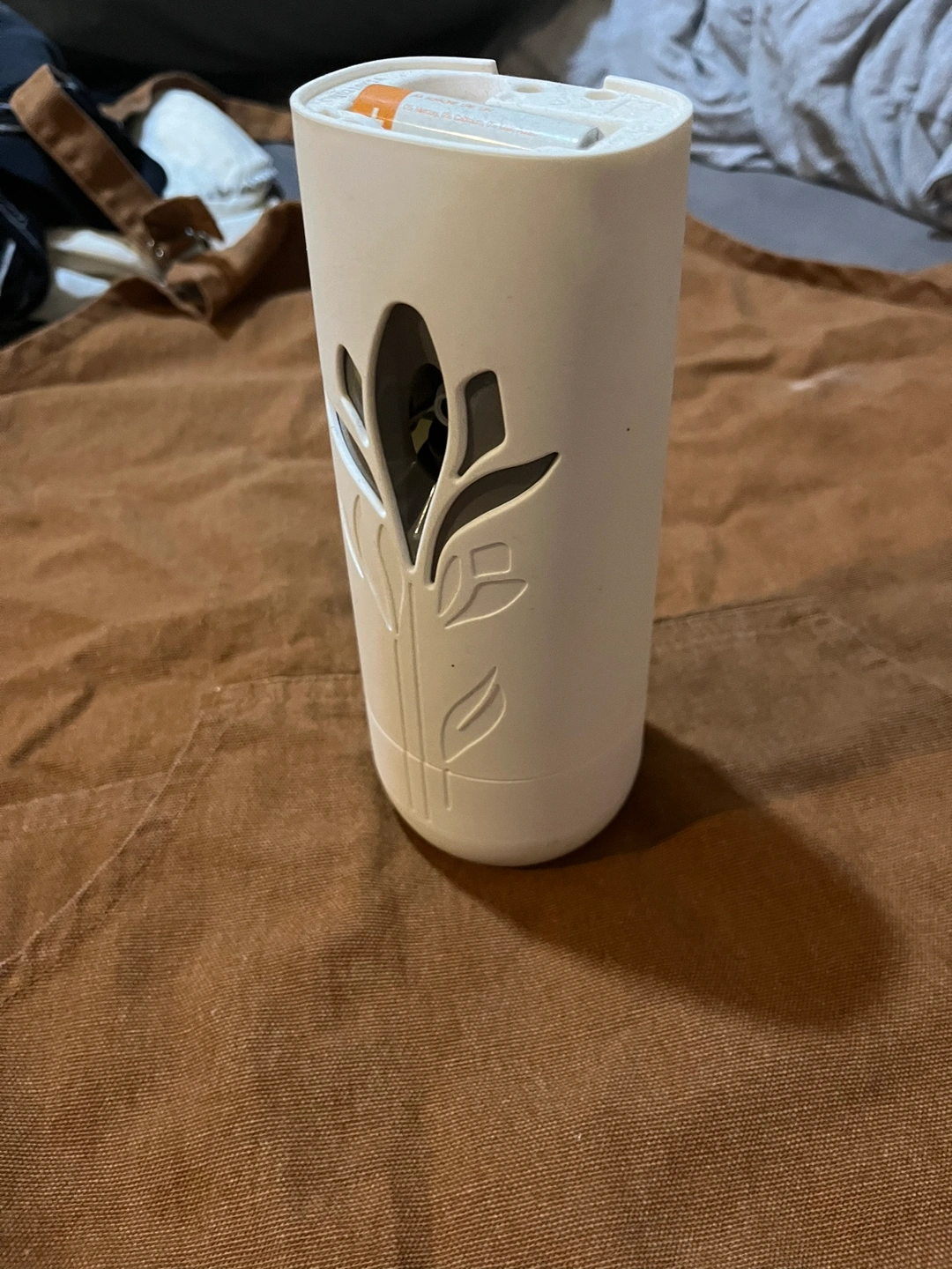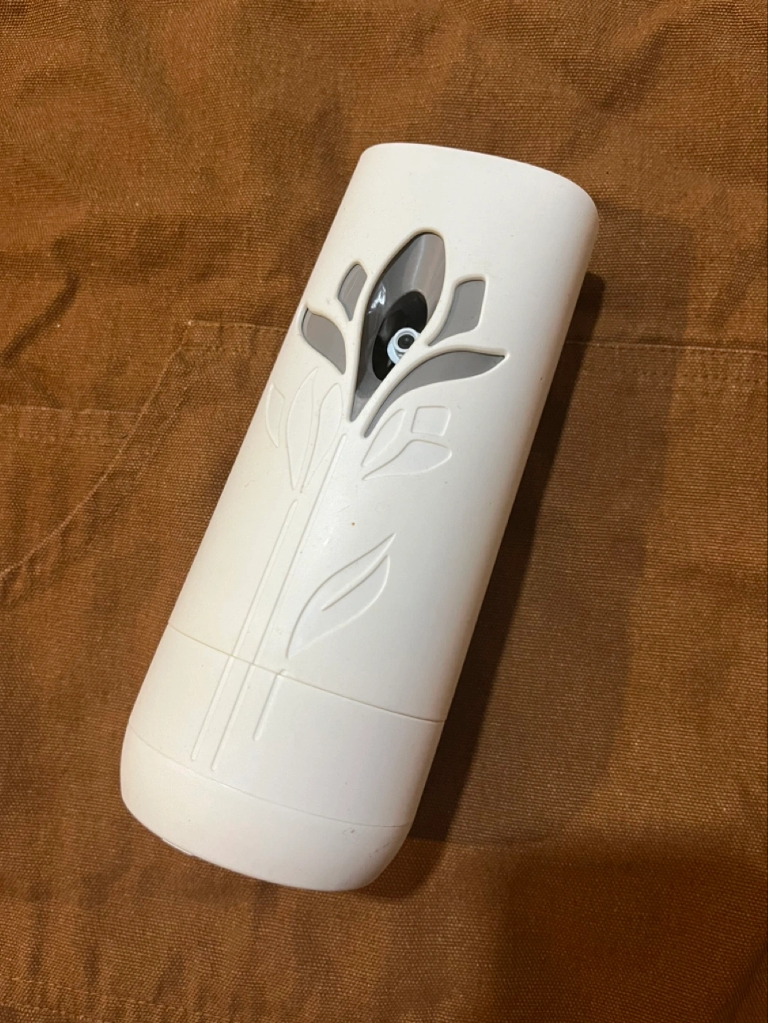 This is a white automatic air freshener with a floral design on the front. Missing top cover for battery compartment but works like new. Usually retails for $29 at shoppers