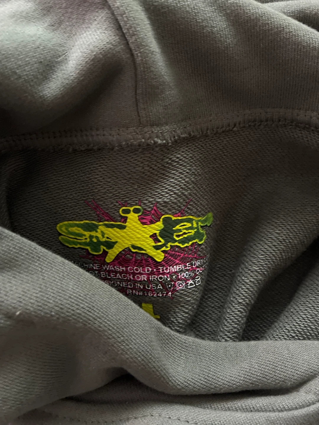 This grey hoodie features a bright green "Sp5der" graphic with a spider web design. It's made from 100% cotton for comfort. This would be great for streetwear!