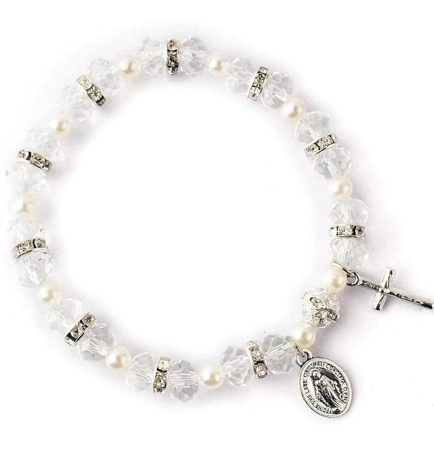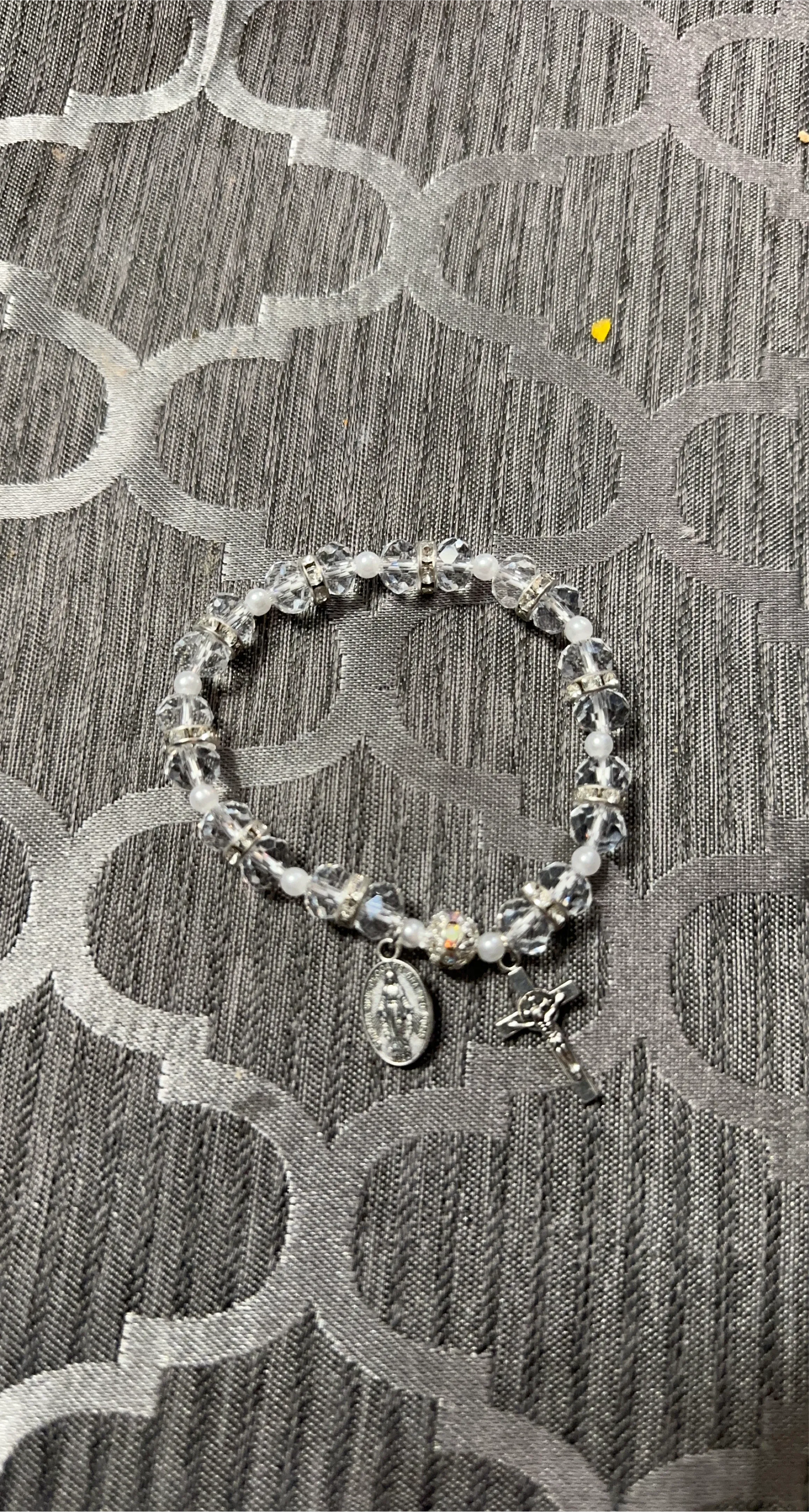 Selling a beautiful crystal rosary bracelet! It features clear crystals, pearl-like beads, and a small cross and medallion. Perfect for adding a touch of elegance to your outfit or as a thoughtful gift