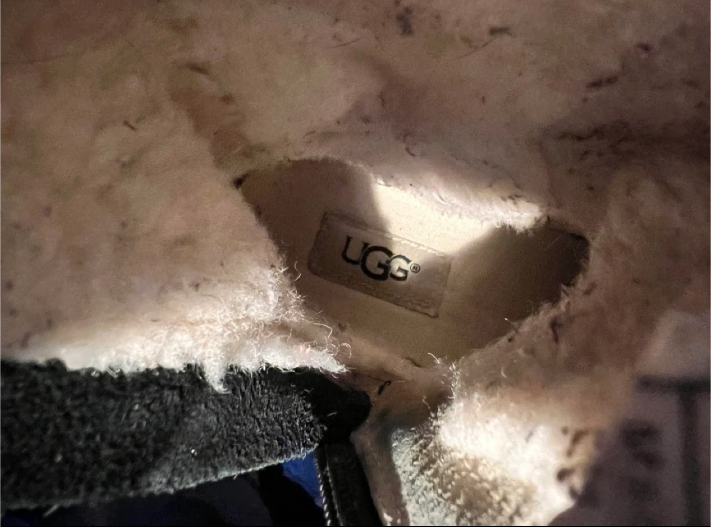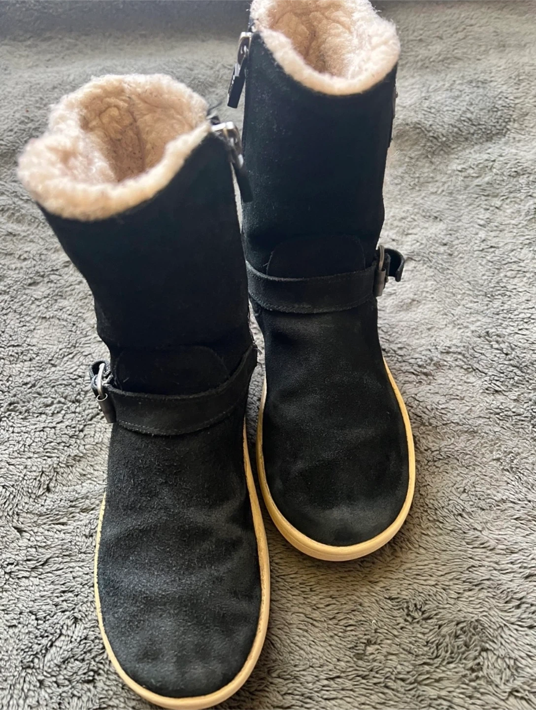 Cozy UGG boots featuring black suede exterior and warm sheepskin lining. They have side zippers for easy on and off. Perfect for keeping your feet warm and comfortable during cooler weather!