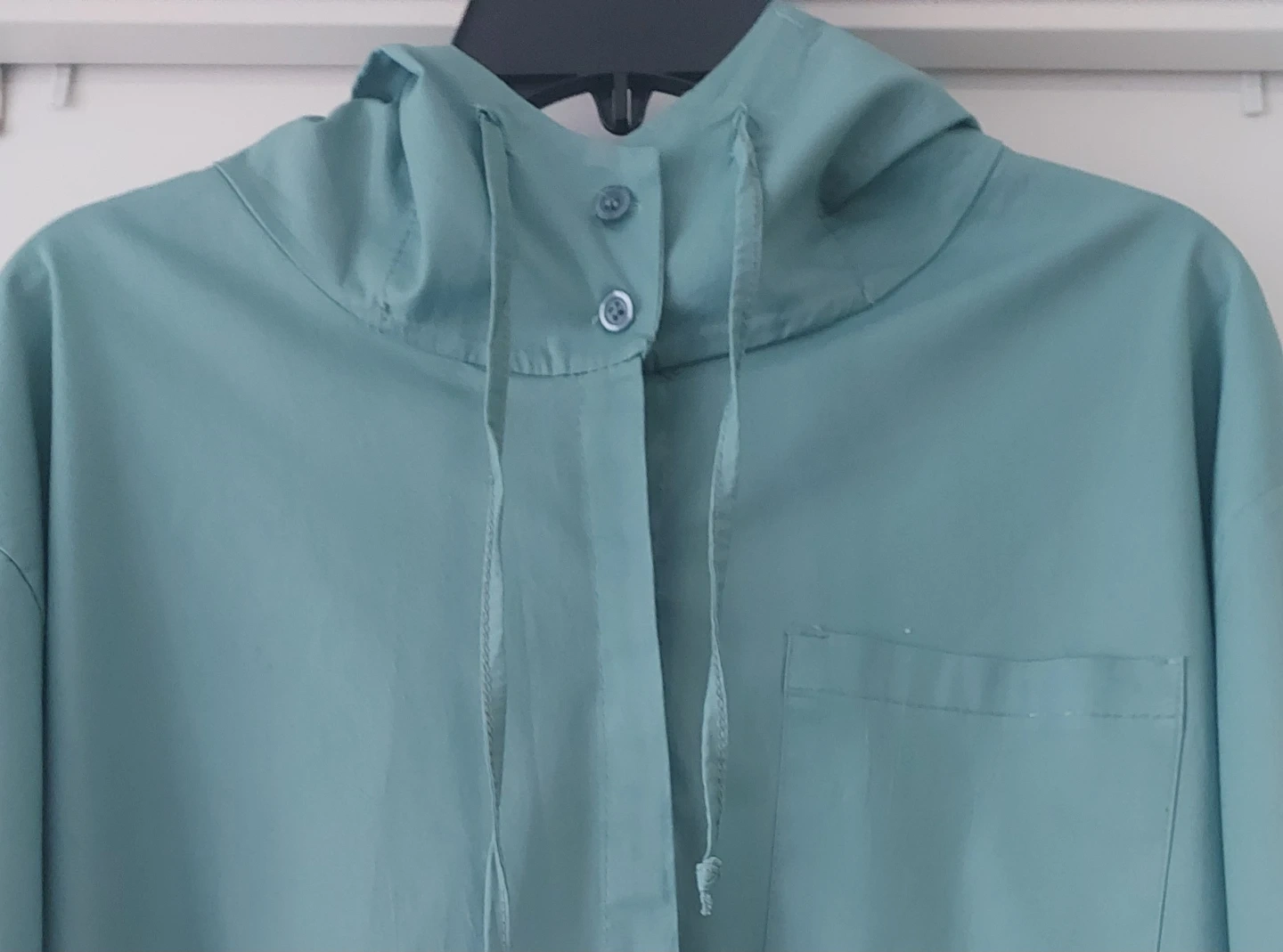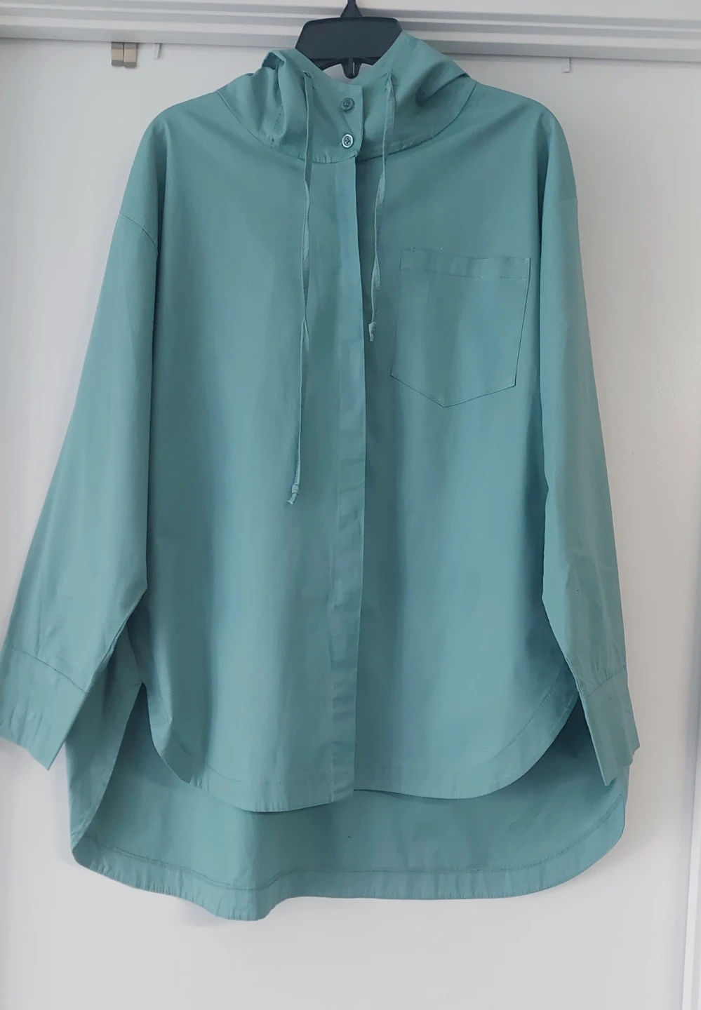 This is a women's hooded button-up shirt in a lovely teal colour. It has a chest pocket and adjustable drawstring details at the neck. It's made of a lightweight fabric perfect for layering. This shirt is great for casual everyday wear! To - XXL