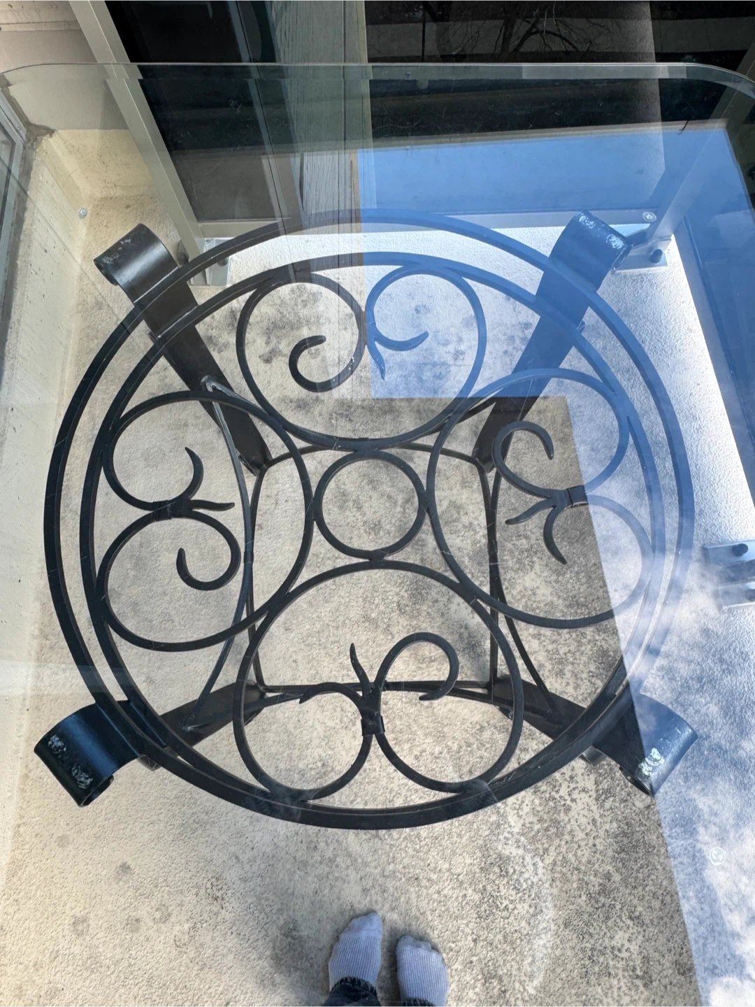 This charming table features a clear glass top and a decorative black metal base. It can be used indoors or outdoors (I've used it indoors for many years)