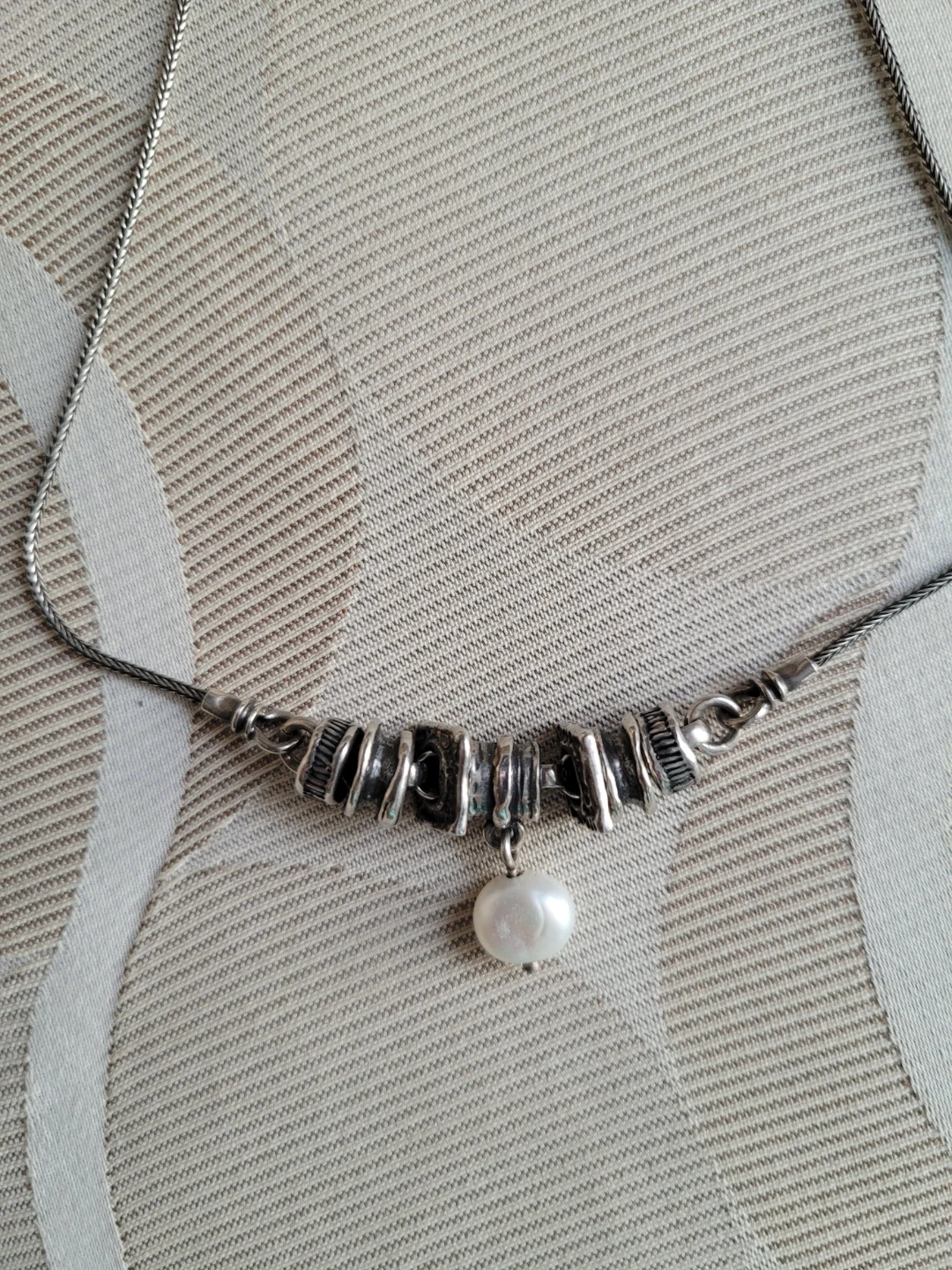 A lovely sterling silver necklace featuring a single pearl. It's made with 925 silver and has an adjustable clasp. This piece would make a nice addition to any jewellery collection.