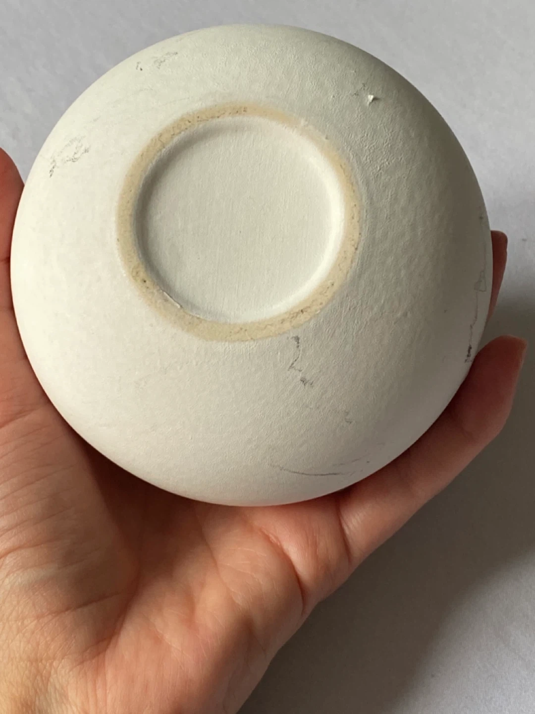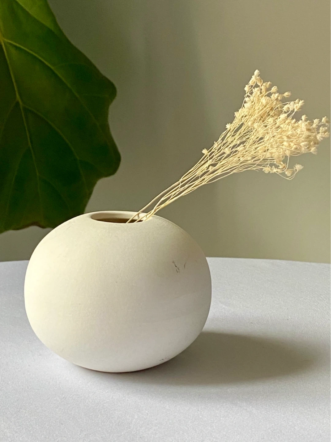 This matte white ceramic vase has a unique spherical shape and a smooth finish. It's perfect for displaying dried flowers or small bouquets. The opening is about 2 inches wide.