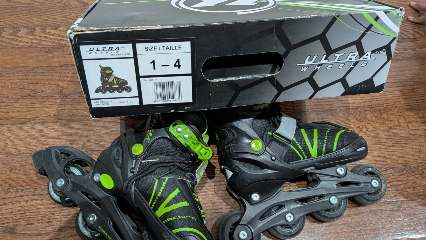 These black and green Ultra Wheels roller skates are adjustable for sizes 1 through 4. They come with the original box. Great for kids learning to skate!