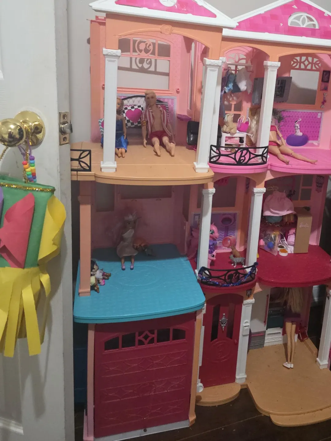 This is a multi-story Barbie Dreamhouse dollhouse with multiple rooms and accessories. It features a working elevator, a pool area, and detailed furniture. It's perfect for imaginative play and storytelling!