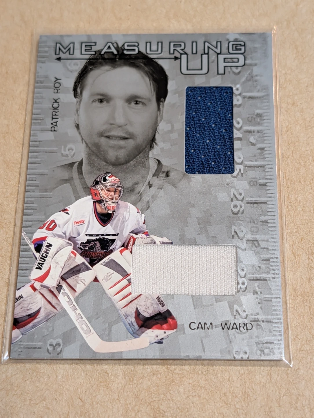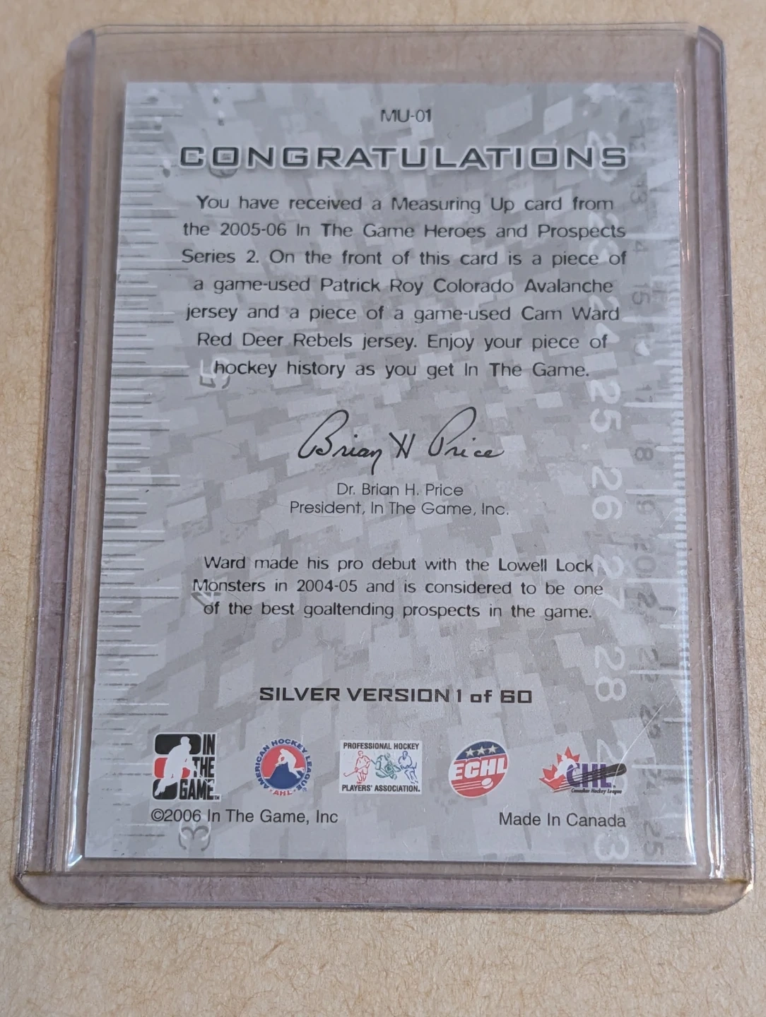 This is a 'Measuring Up' card from the 2005-06 In The Game Heroes and Prospects Series 2. It features game-used jersey pieces from Patrick Roy and Cam Ward. This is the Silver Version, numbered 1 of 60. It's a great piece for hockey memorabilia collectors!