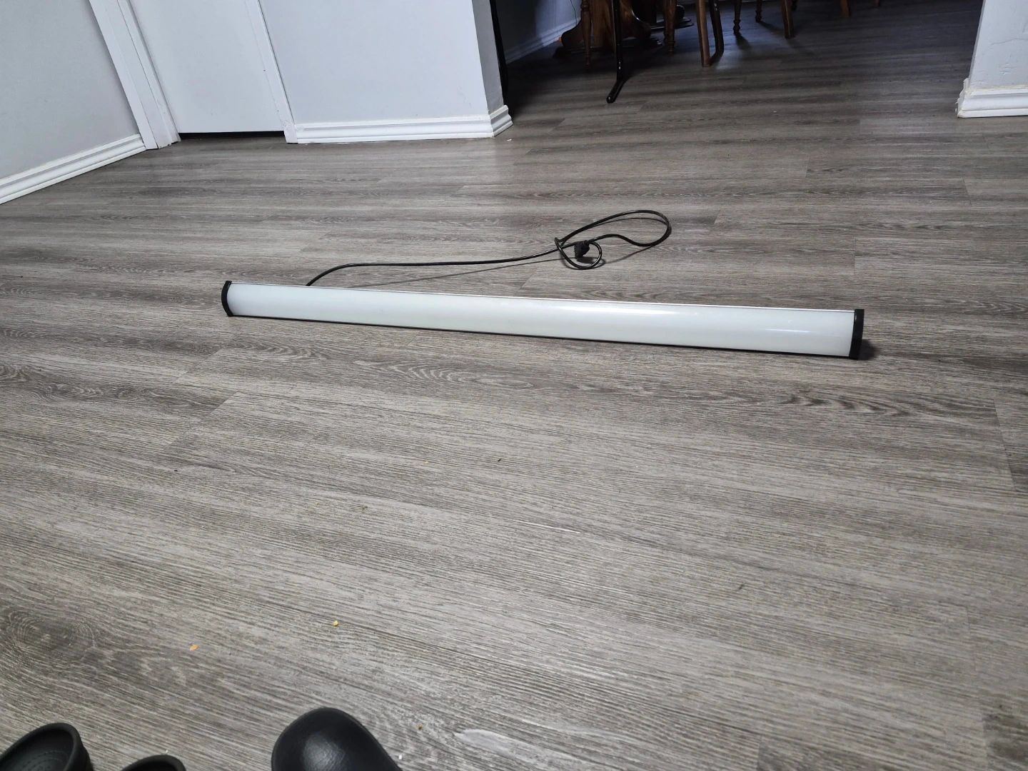 This is a linear fluorescent light fixture. It's white with black end caps. It comes with a power cord and plug. It's a good size for workspaces or garages.