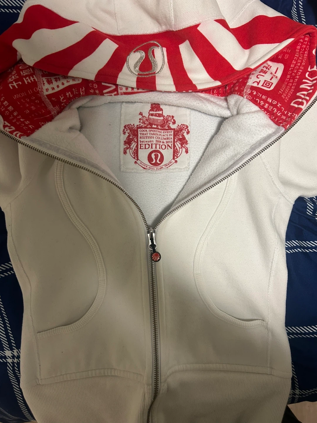 This Lululemon zip-up hoodie is white with a red and white striped lining. It's an "Edition" piece related to a sporting event in British Columbia between 2009 & 2011. The hoodie has a full zip closure and pockets.
