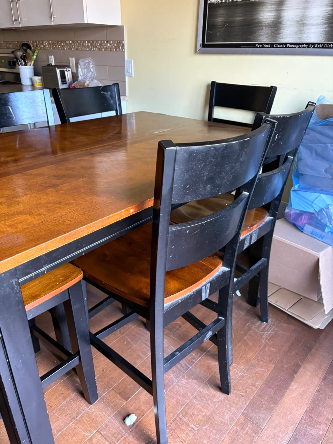 A two-toned dining set featuring a rich wood grain table top with black legs and matching chairs. This set includes one table and six chairs, perfect for family meals or entertaining guests. The table offers ample space for dining and conversation.