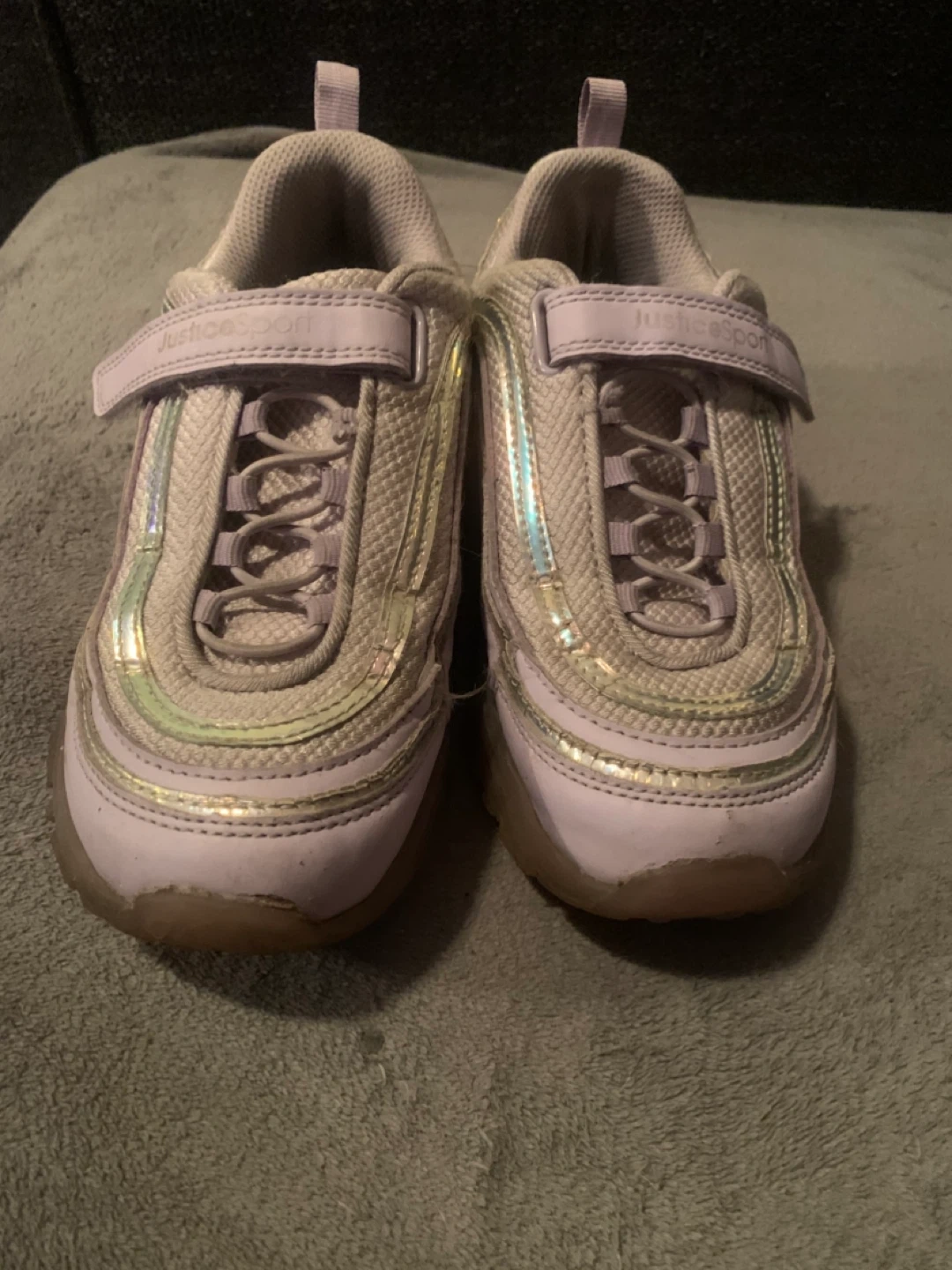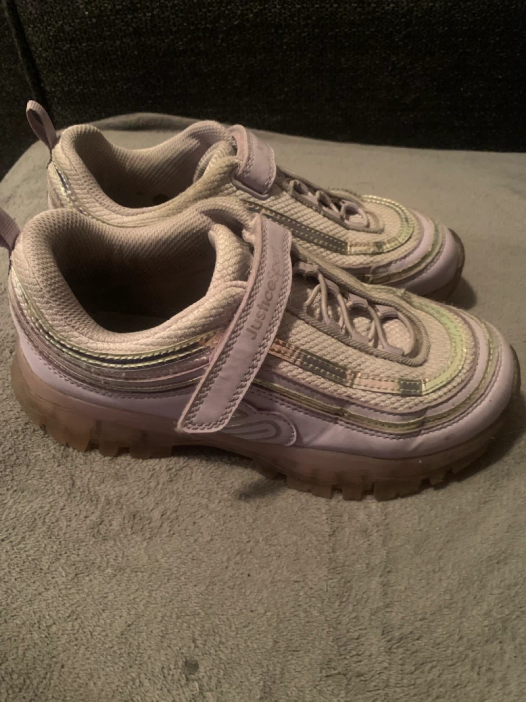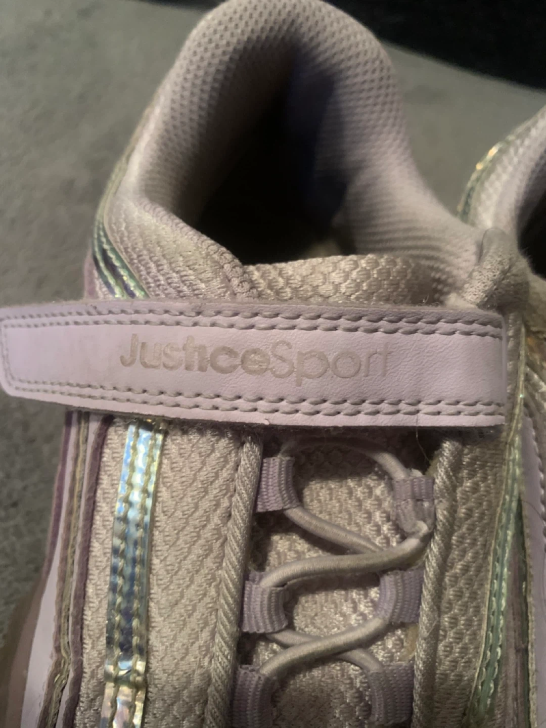 Light purple sneakers from Justice Sport. They feature adjustable velcro straps and decorative laces. The soles are a translucent rubber.