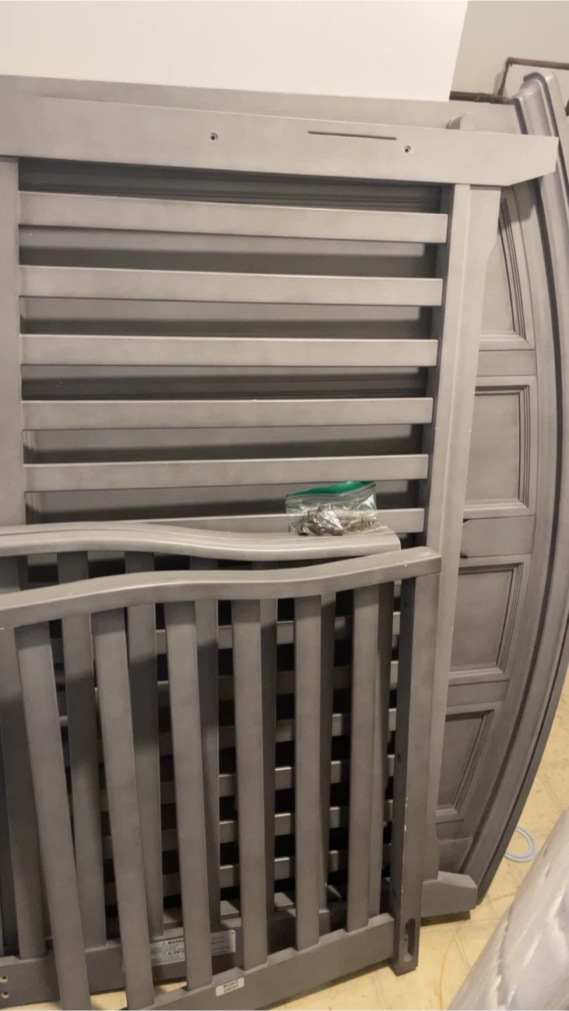 This is a DaVinci Charlie 4-in-1 Convertible Crib in grey. It's a solid wood crib, perfect for a nursery. Includes hardware for assembly. I have no space for it. And I no longer need it.