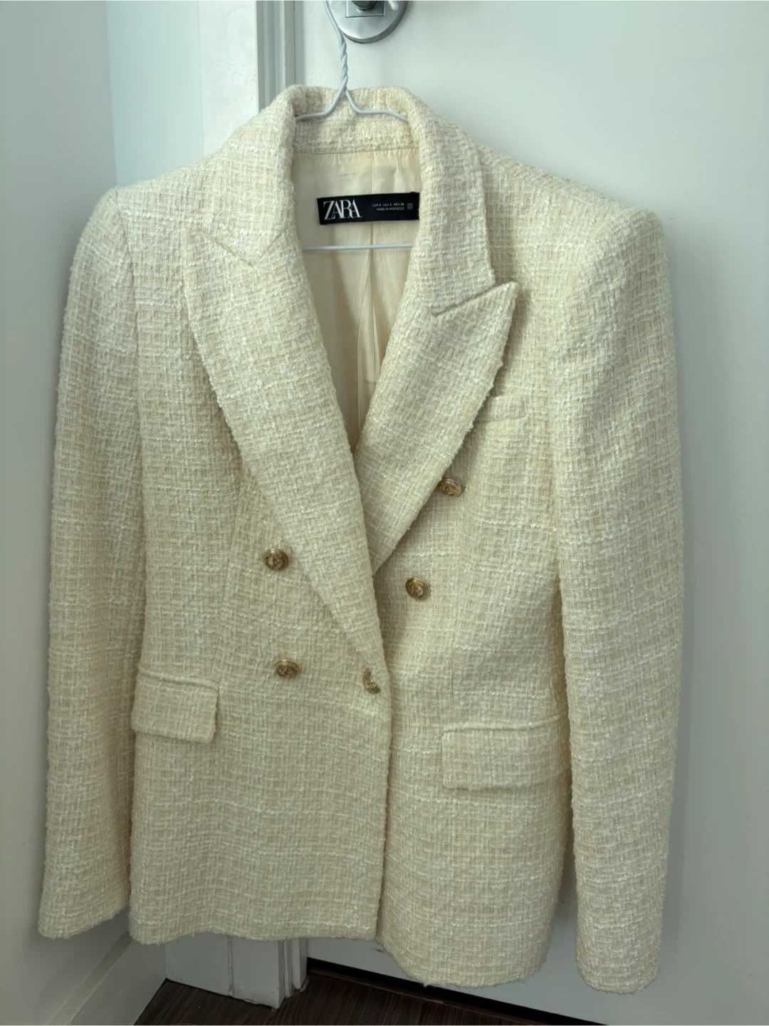 Cream textured double-breasted blazer from ZARA. It's a size small and features gold-tone buttons. This blazer is great for dressing up any outfit!