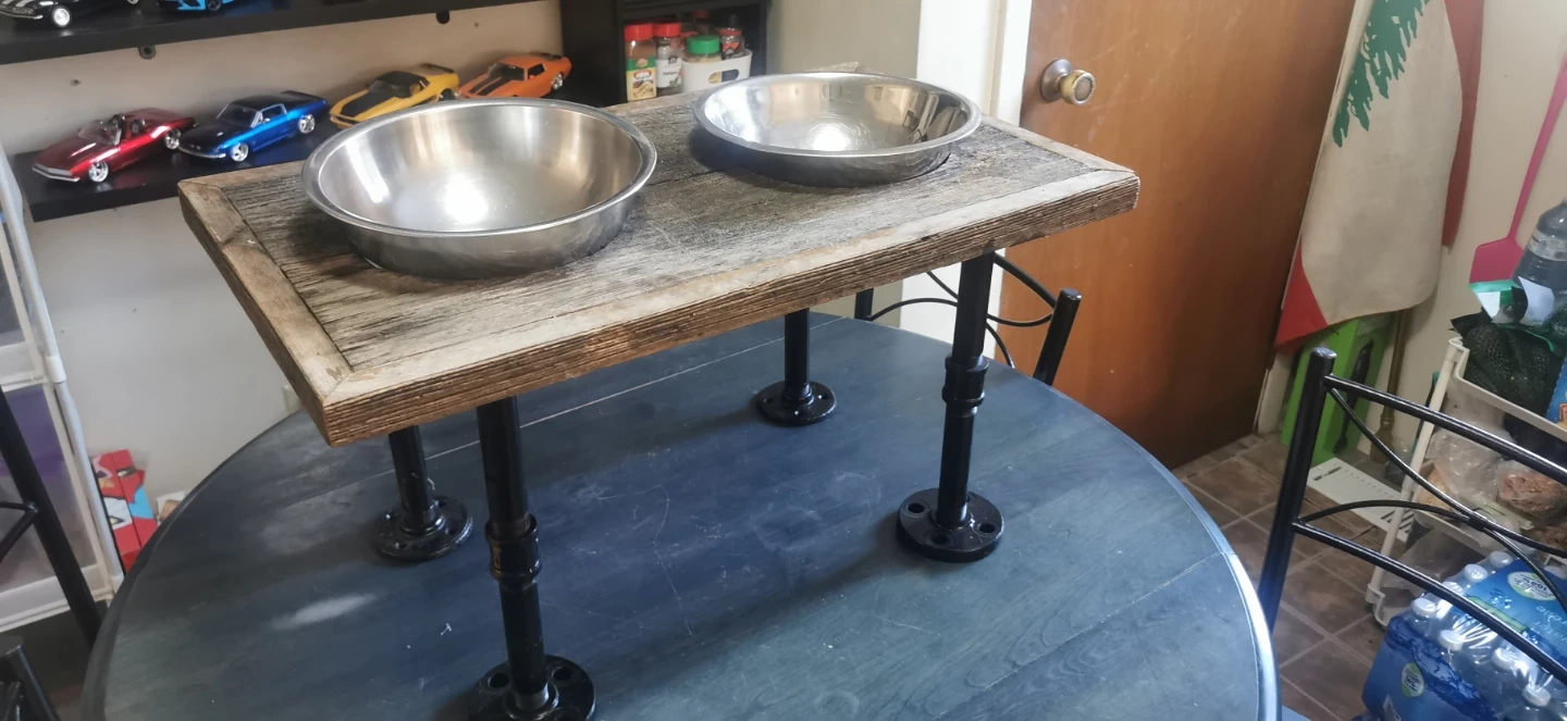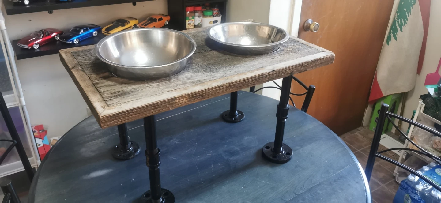 This rustic pet feeder has a distressed wood top and industrial pipe legs. It includes two stainless steel bowls. Great for elevated feeding for your furry friends!