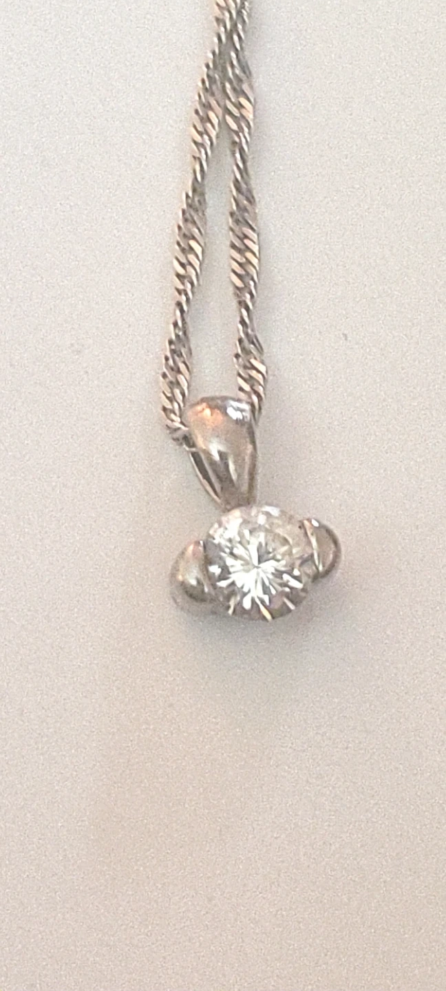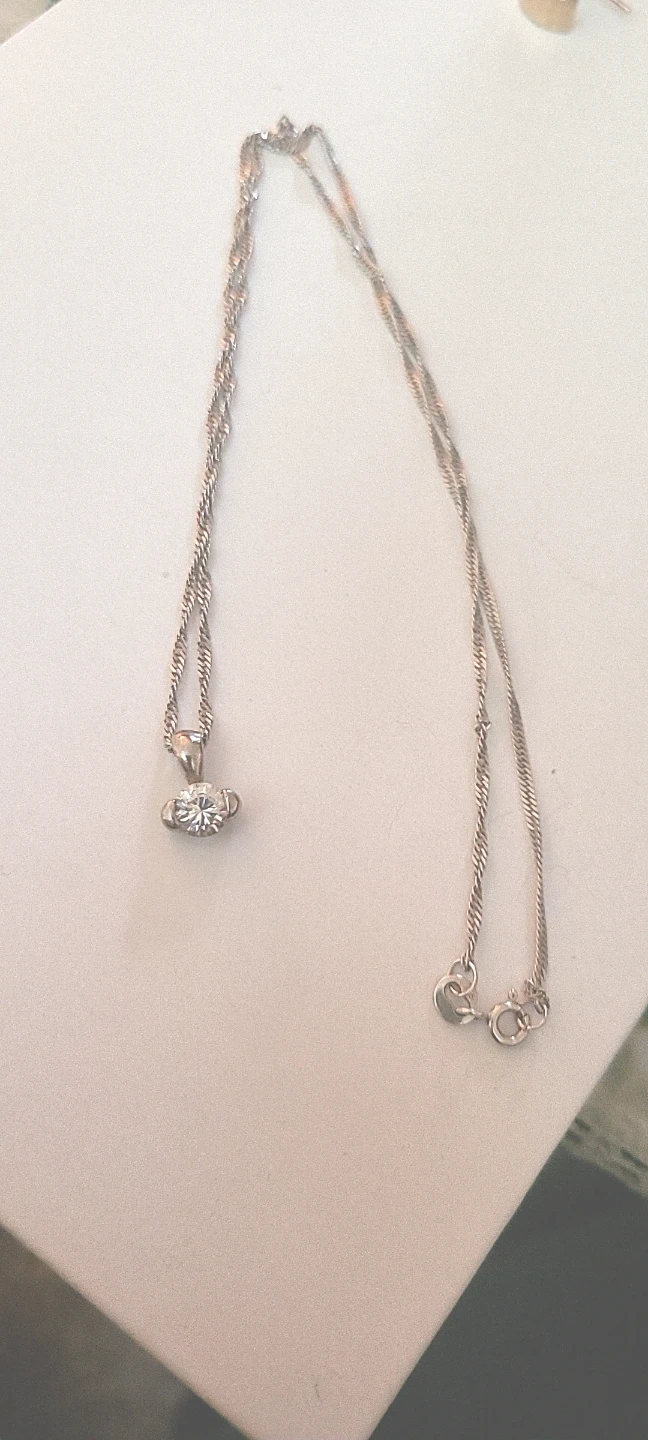 A delicate 925 sterling silver chain with a sparkly solitaire pendant. This necklace is perfect for adding a touch of elegance to any outfit.