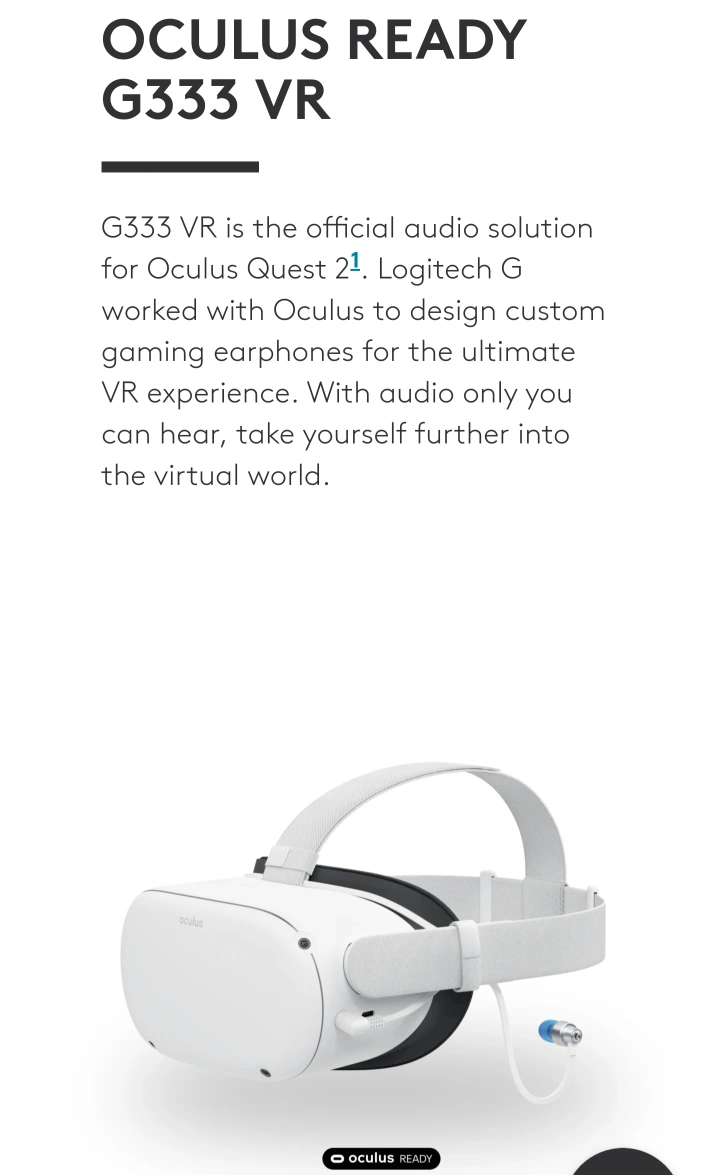 G333 VR is the official audio solution for Oculus Quest 21Oculus Quest 2 headset and controllers sold separately. Logitech G worked with Oculus to design custom gaming earphones for the ultimate VR experience. With audio only you can hear, take yourself further into the virtual world. In the Box: G333 VR Gaming Earphones for Oculus Quest 2 3 custom velcro straps 3 sizes of ear tips (S, M, L) User documentation