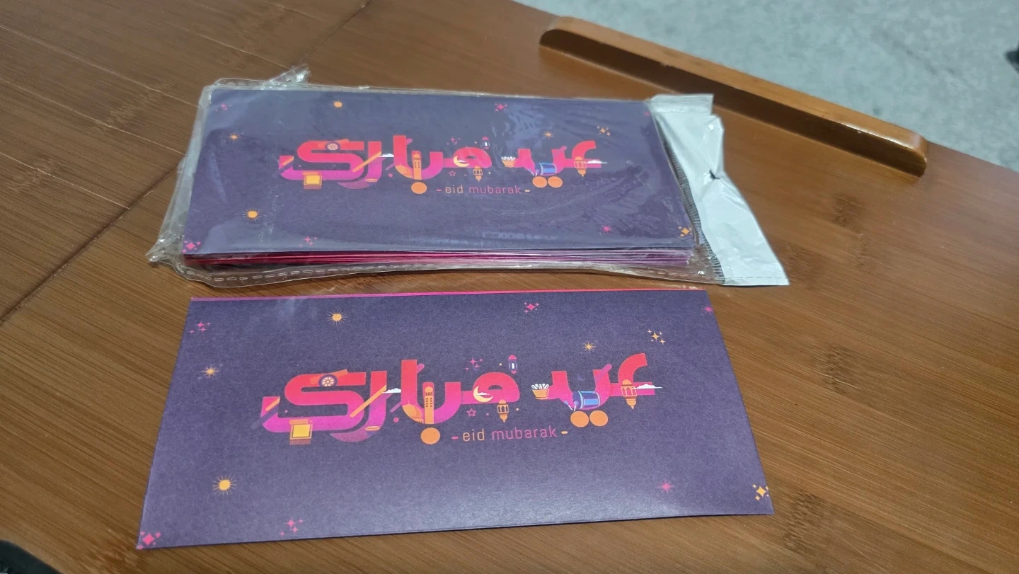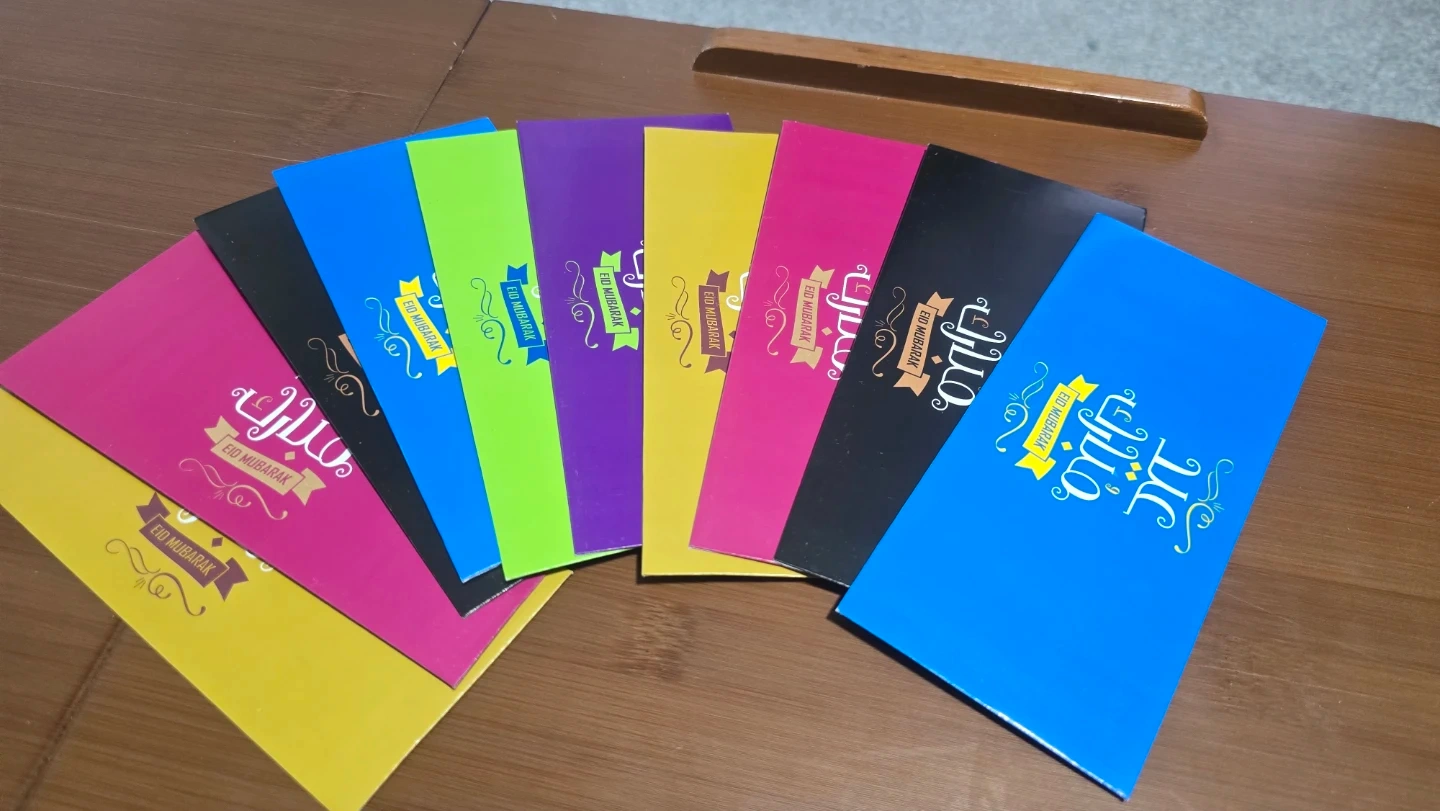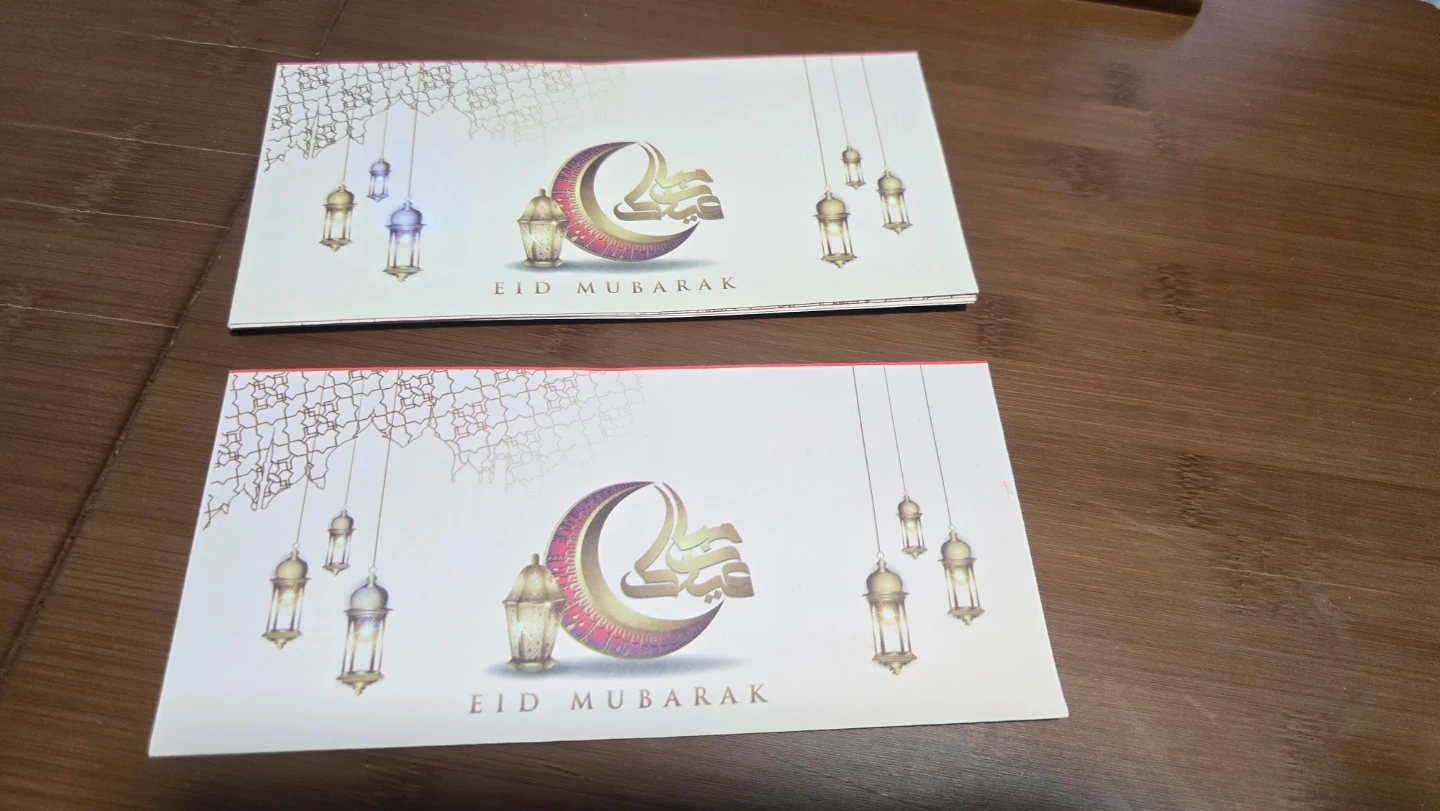 A set of envelopes designed for Eid Mubarak celebrations. Features various colourful patterns and festive graphics. Perfect for gifting cash or cards during Eid. Includes multiple designs to suit different preferences.