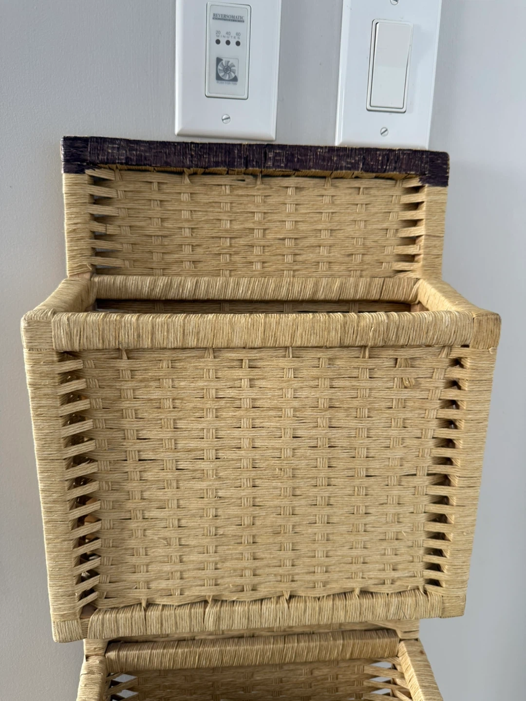 This hanging wall organizer features three woven pockets for storage. It's made from a natural woven material in a light tan color. The top trim is dark brown. This organizer is great for storing mail, magazines, or small items.