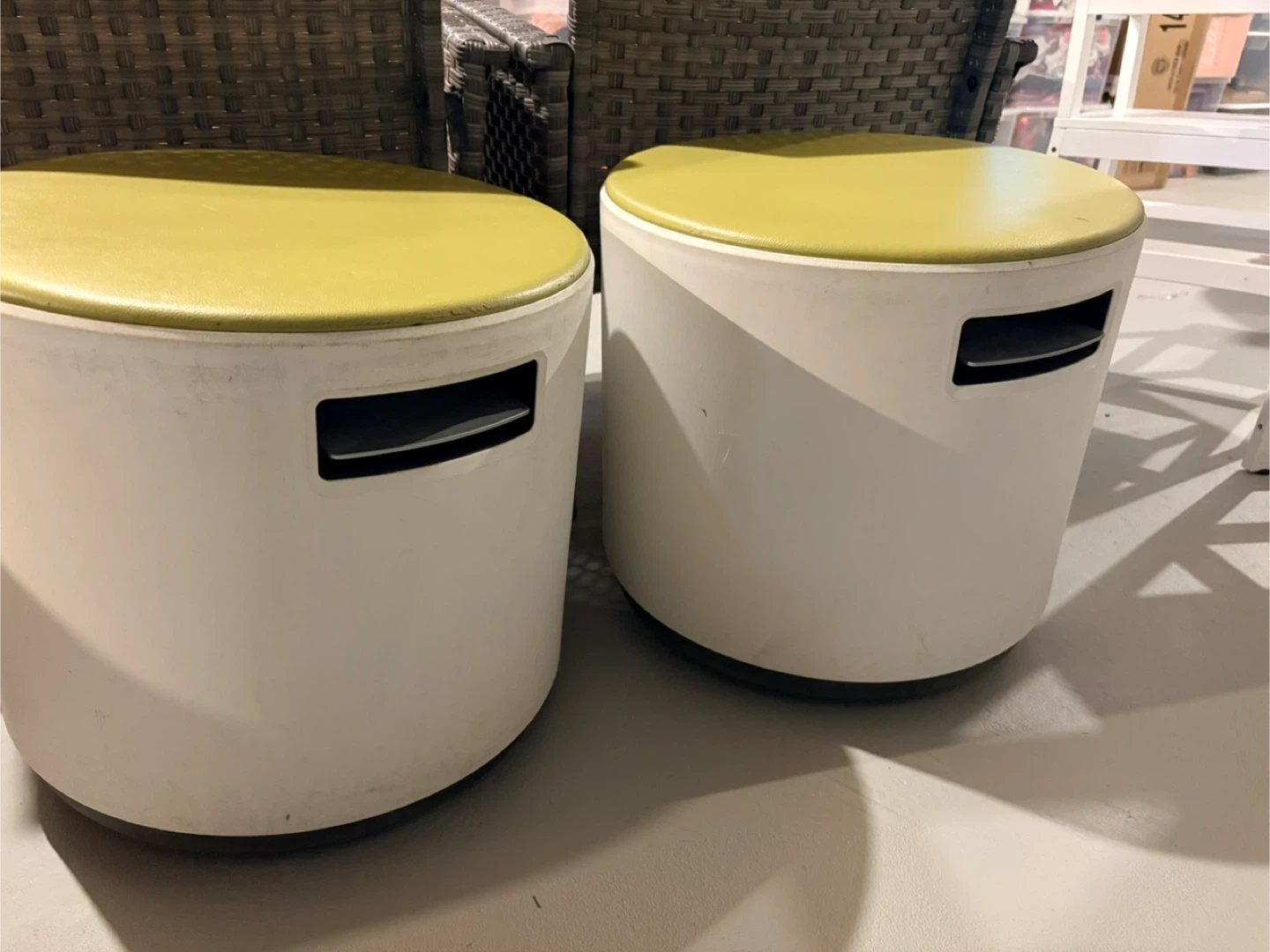 Two modern round ottomans or stools with a grey base and white cylindrical body. They feature a light green vinyl top and built-in handles for easy carrying. These versatile pieces can be used for seating or as footrests. Adjustable height.