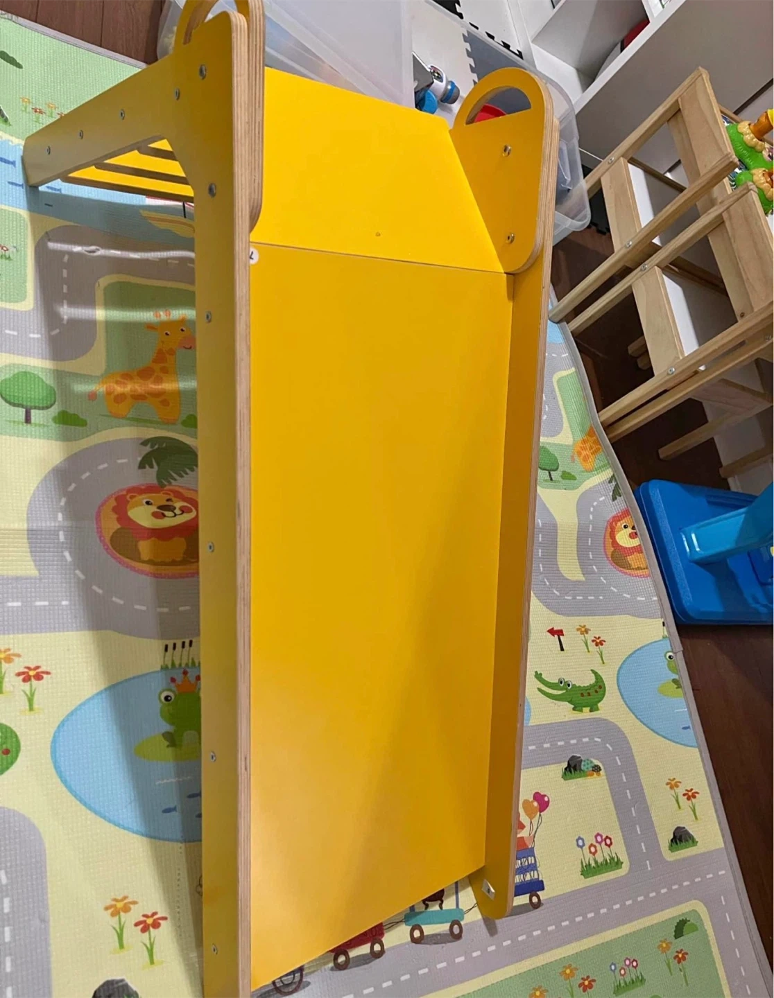 This yellow wooden climber slide is perfect for little ones. It's designed for indoor play and made from durable wood. It offers a safe way for toddlers to develop gross motor skills. A fun addition to any playroom! Pick up from delta Surrey or Langley