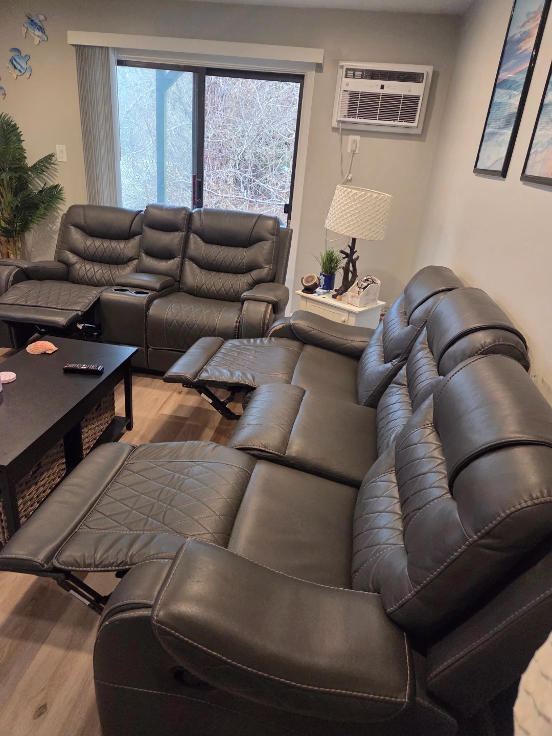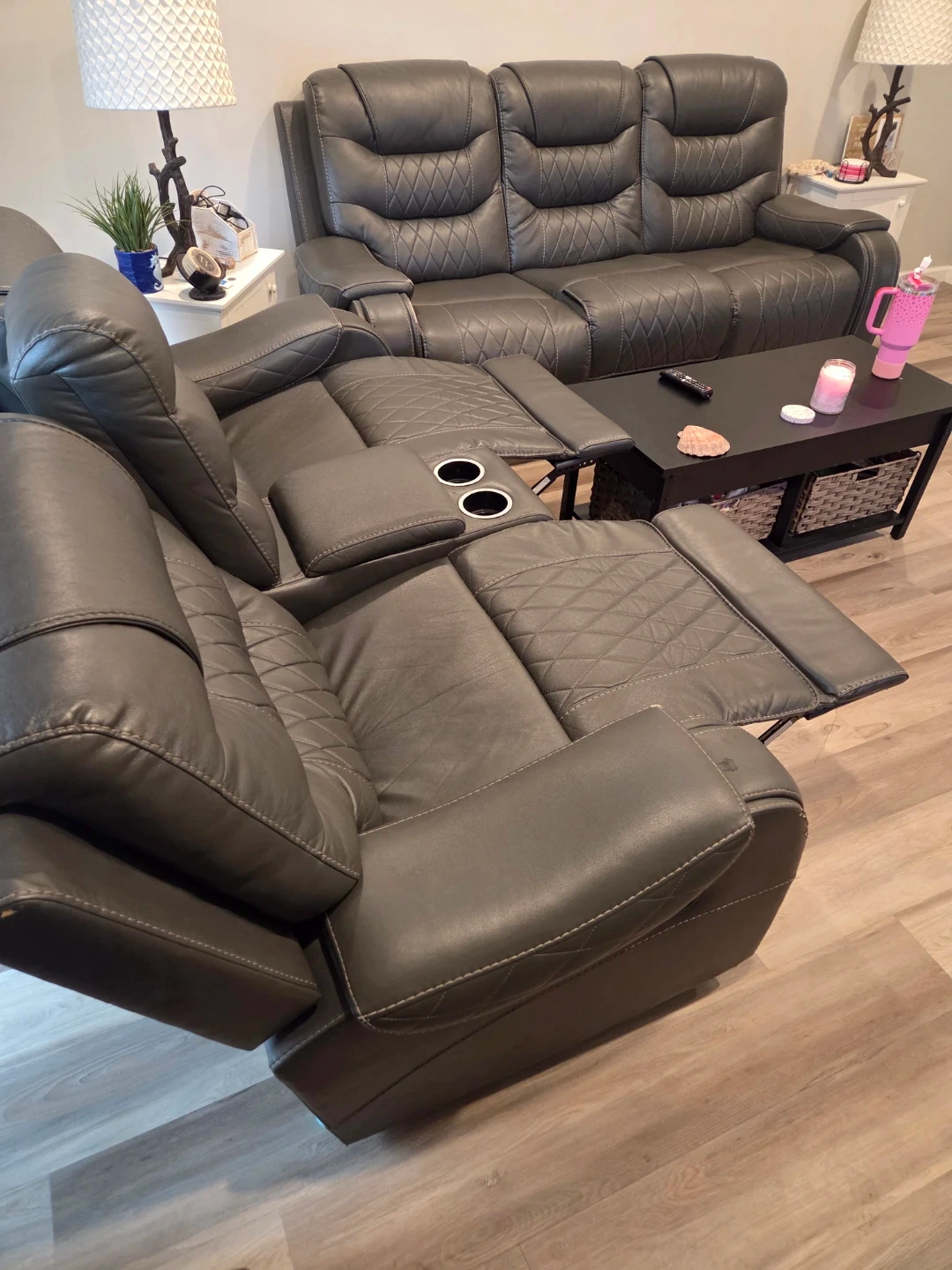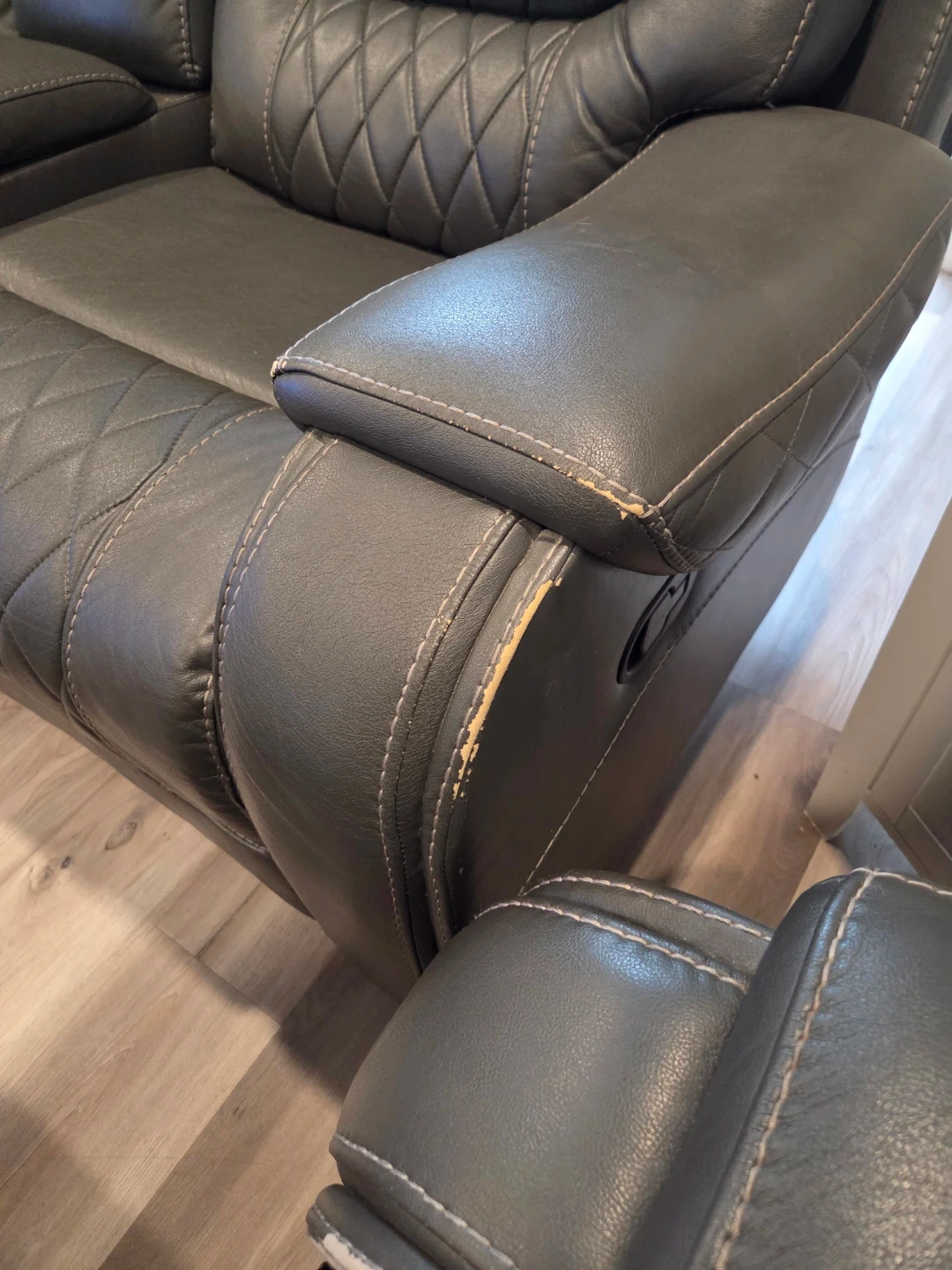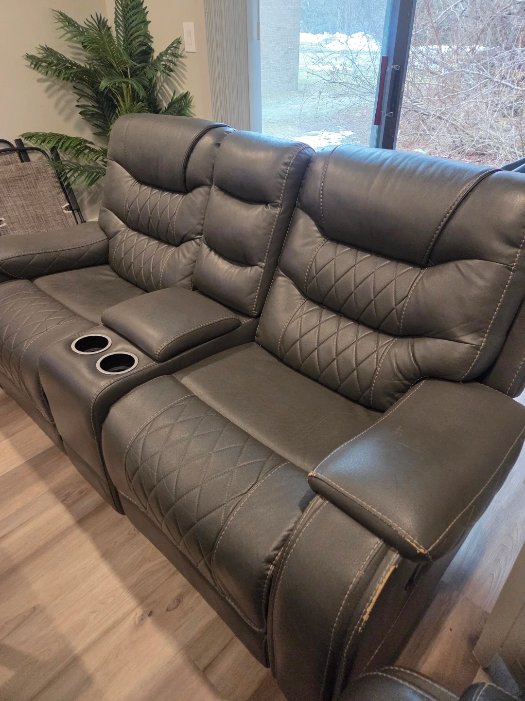 2 Gray faux leather reclining loveseat. Features diamond stitching detail and two cup holders in the center console. Some wear and tear visible on the armrests, as shown in photos. Perfect for a living room or home theater.