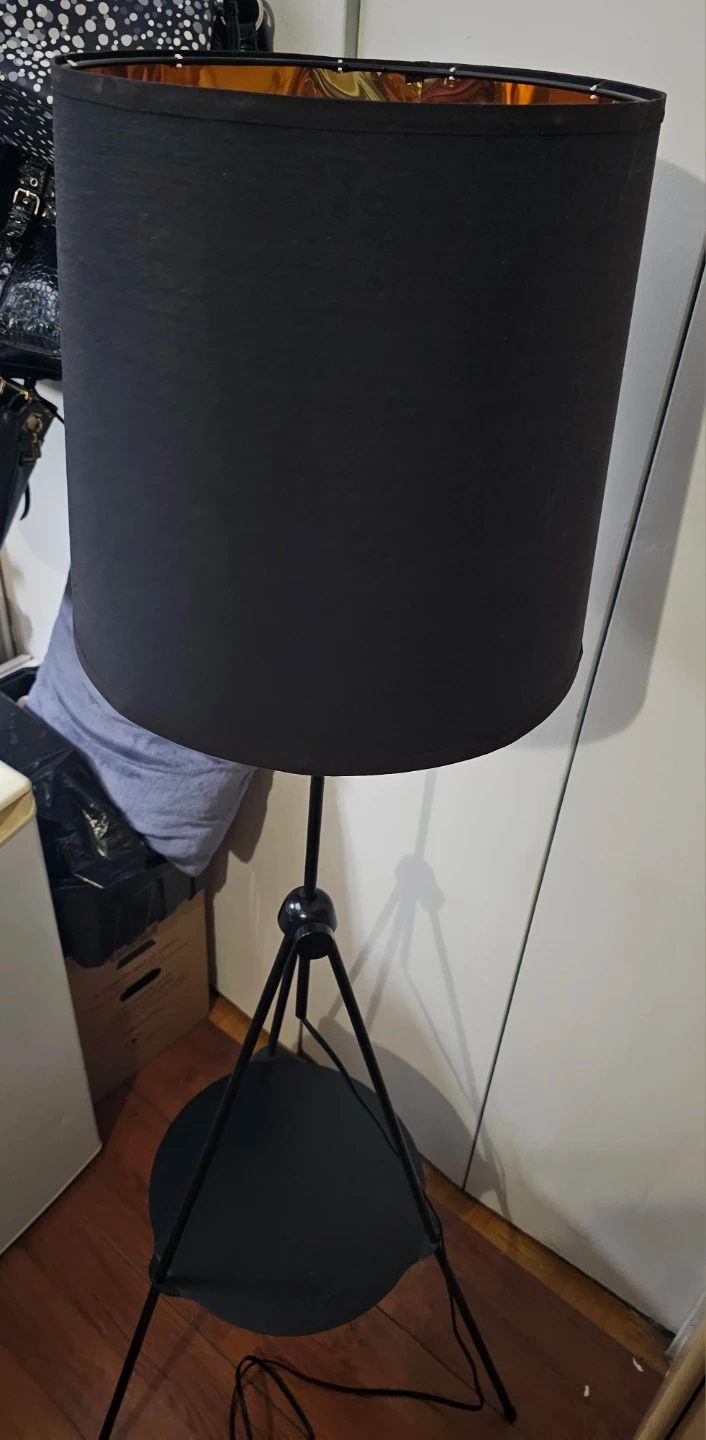 This stylish floor lamp features a black fabric drum shade with a reflective gold interior. Its sturdy black tripod base includes a small circular shelf for convenience. It's a great addition to any living space!