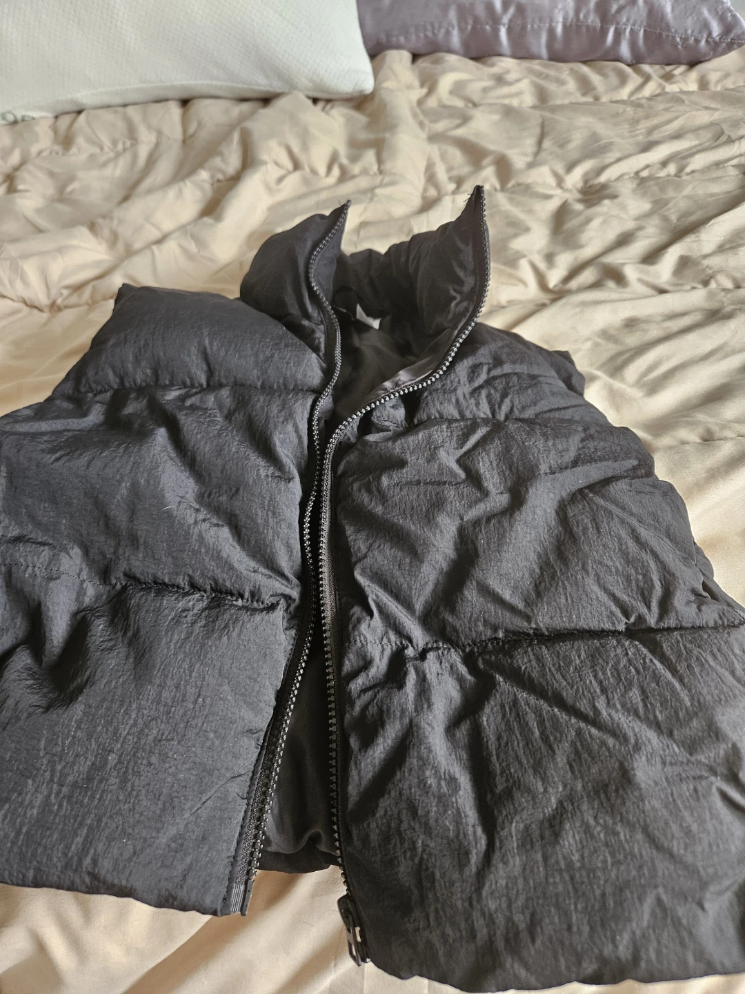 A black puffer vest with a full zip closure. It's a stylish and warm layering piece for cooler weather. Brand new never worn just to small for me now