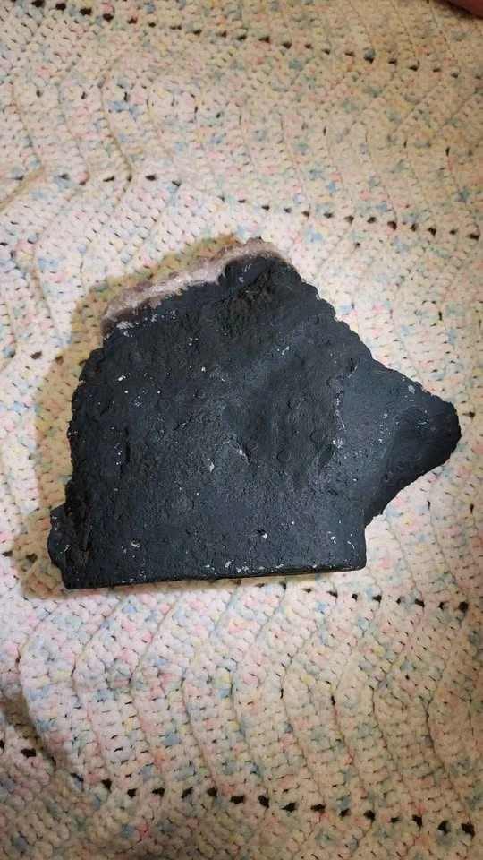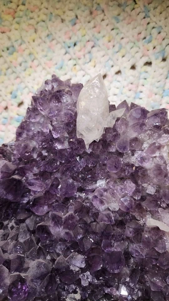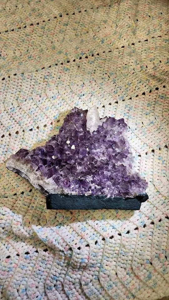 Beautiful amethyst geode. Big purple crystal cluster. Has a cool clear crystal point on top. Dark base for display. Looks great on a shelf or desk. Weighs 5lbs 1.3oz. 9.5" wide X 9" tall.
