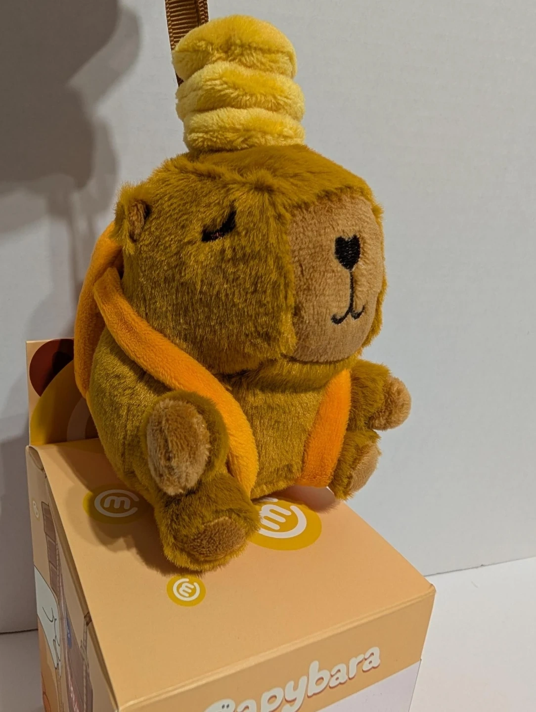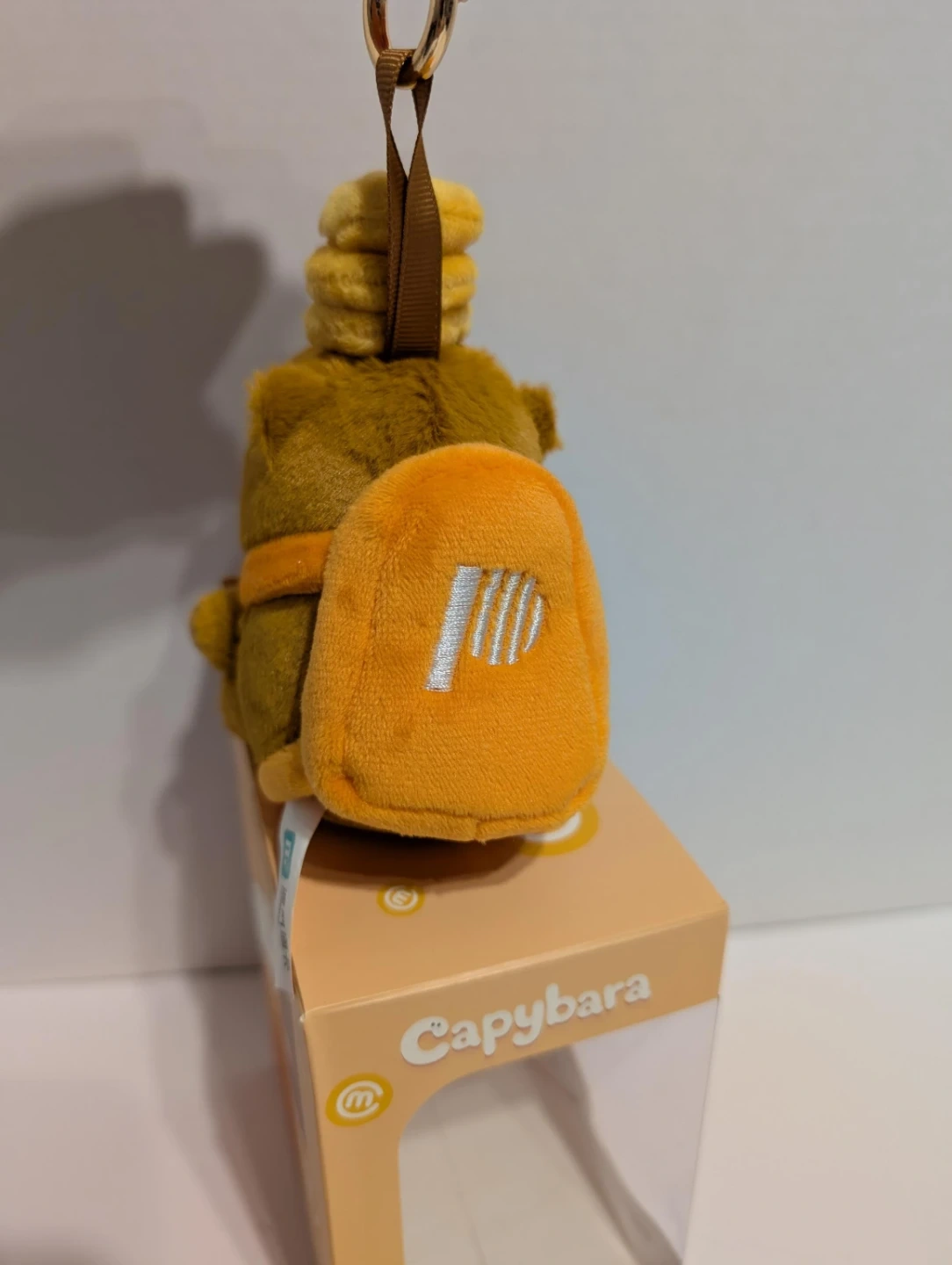 This is a cute capybara plush toy with a keychain attachment. It's soft and comes in its original packaging. The plush is brown with orange accents and a yellow hat-like accessory.