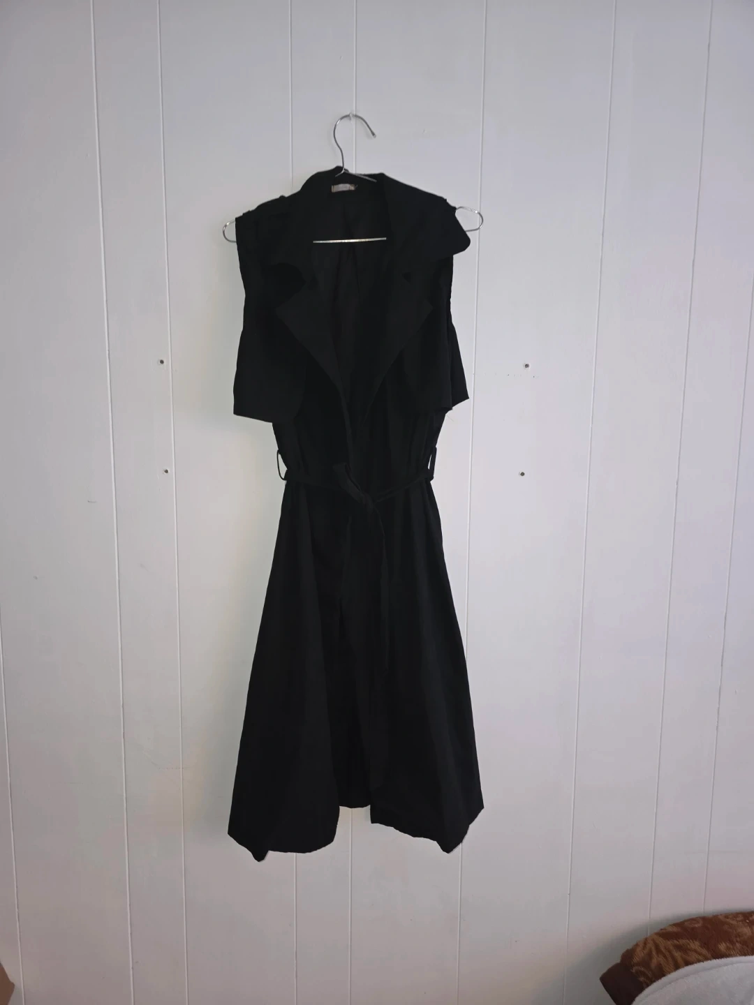 Selling a stylish black sleeveless trench dress. It's in great condition and ready for a new wardrobe. Perfect for layering or wearing on its own during warmer weather!