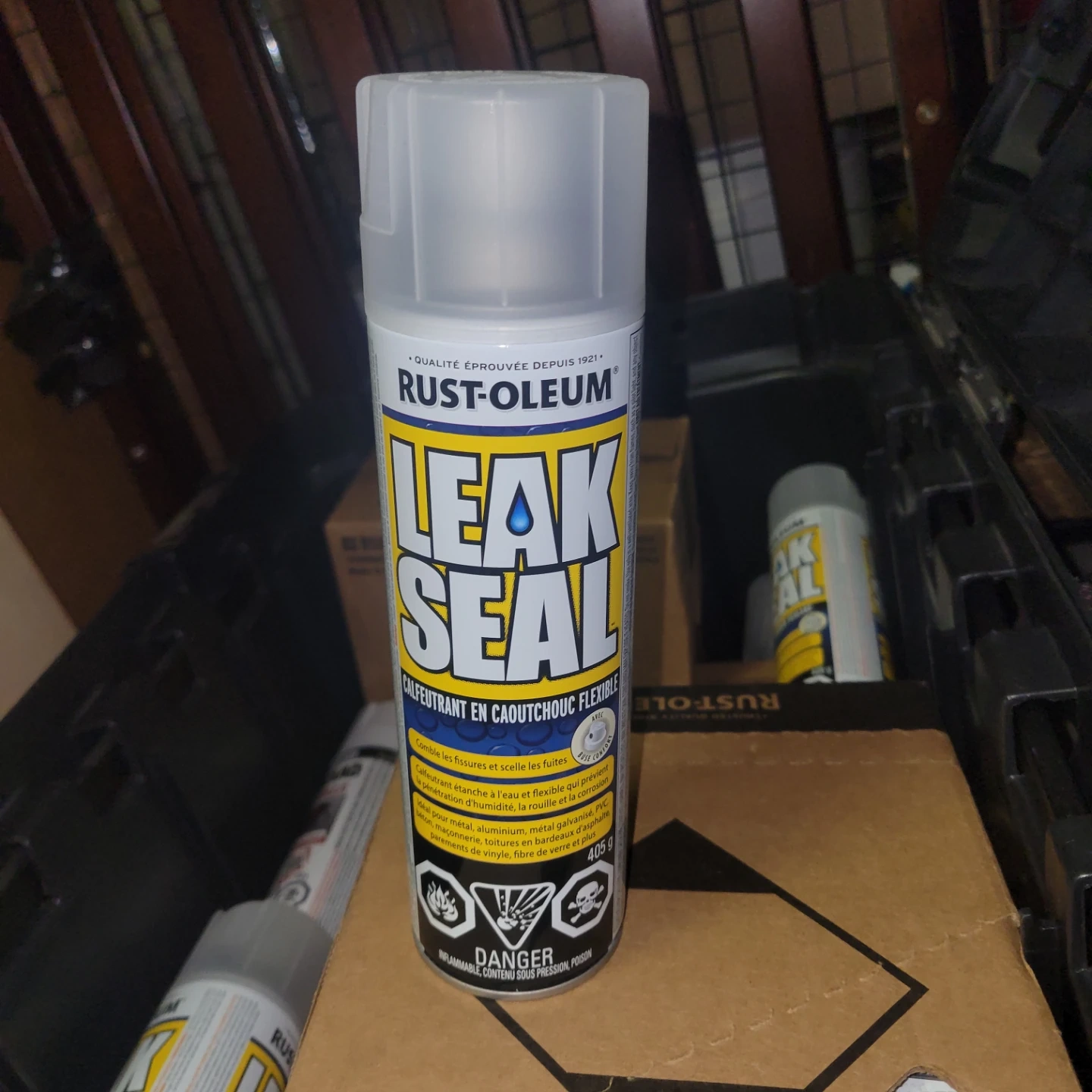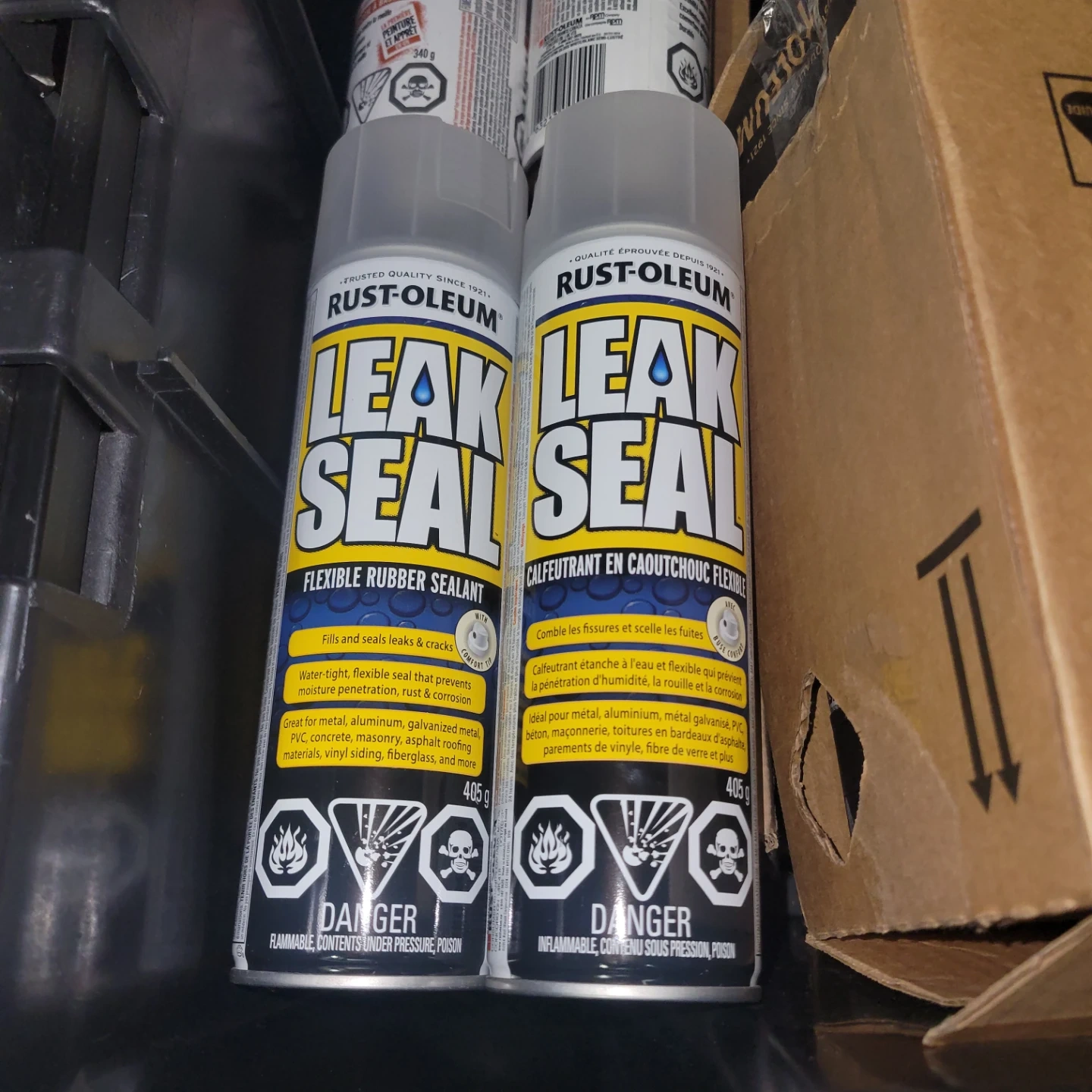 Selling cans of Rust-Oleum Leak Seal Flexible Rubber Sealant. This sealant fills and seals leaks and cracks. It's water-tight and flexible, preventing moisture penetration and corrosion. Great for metal, aluminum, galvanized metal, PVC, concrete, masonry, asphalt roofing, materials, vinyl siding, fiberglass, and more. Each can contains 405 g