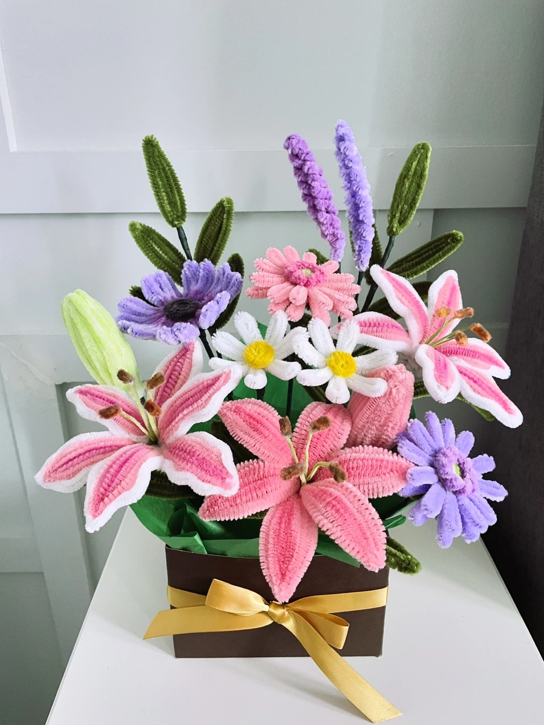 A colourful arrangement of pipe cleaner flowers, including lilies, daisies, and lavender, presented in a brown box with a gold ribbon. It's a charming, everlasting decoration. This unique piece adds a pop of colour to any space without requiring any maintenance. DM to order