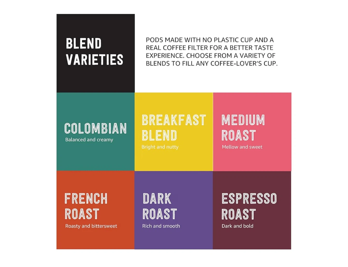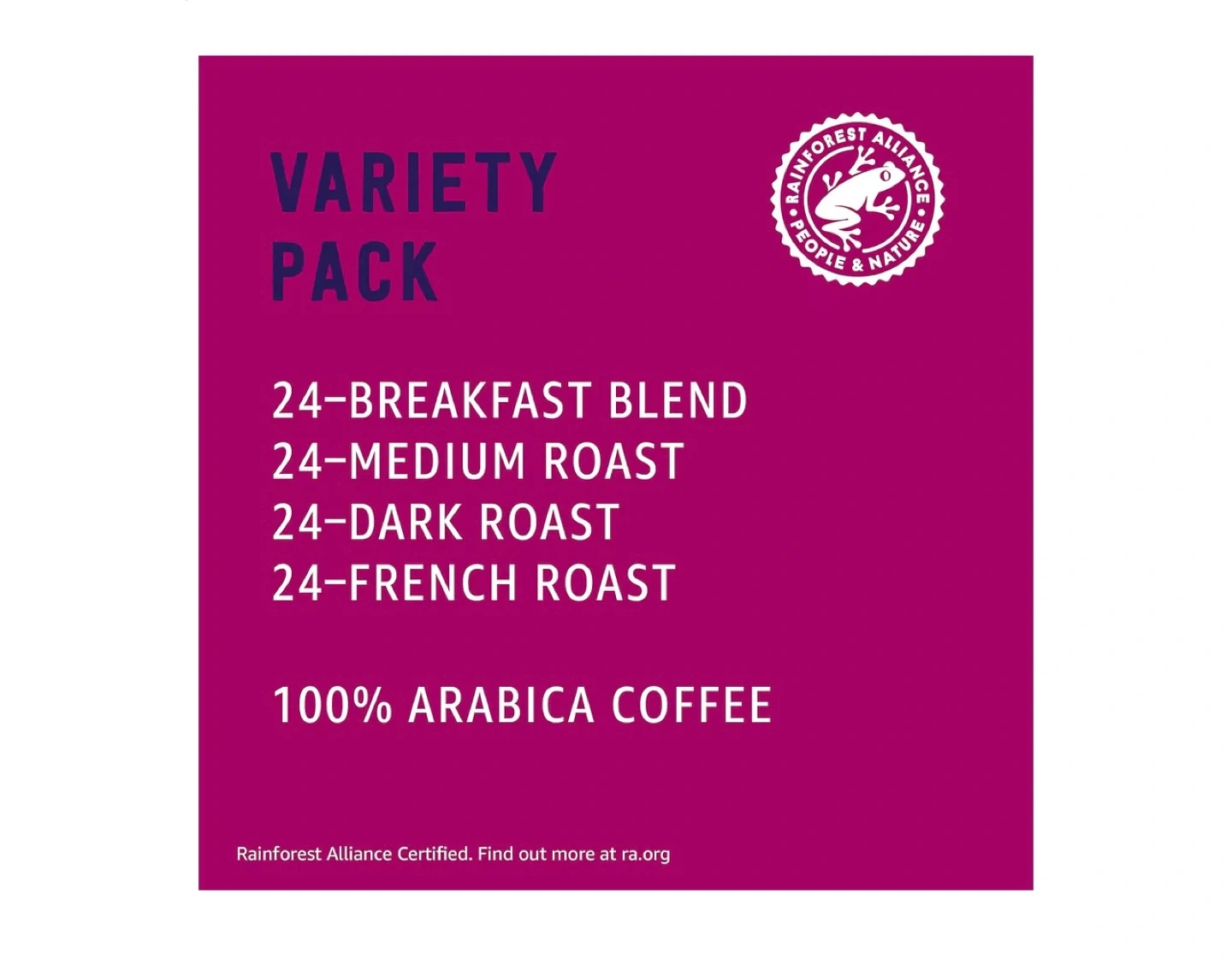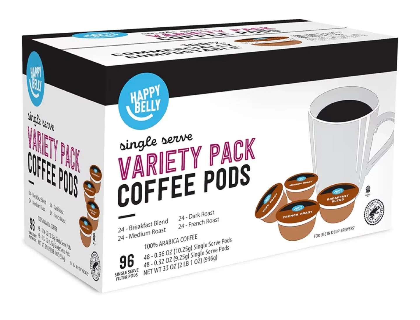Selling a box of Happy Belly Variety Pack Coffee Pods. The box includes 96 single-serve filter pods, offering a variety of blends. Enjoy a selection of 24 Breakfast Blend, 24 Dark Roast, 24 Medium Roast and 24 French Roast pods. Compatible with Keurig 1.0, Keurig 2.0, Keurig K-Elite, Keurig K Supreme Plus, and Cuisinart SS-5P1 brewers